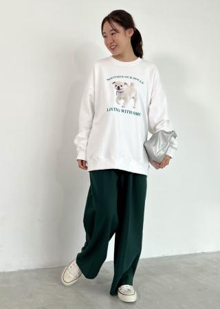 店舗でのこのスエットにロングスカート、上にカーディガンというディスプレイが可愛くて、しかもおもちくんに一目惚れ。後から有名なわんこだと知りました。ホワイトのスウェットなので、意外と綺麗めカジュアルで子供っぽくならないと思います。裏起毛ではないので、夏前まで着れそうです。