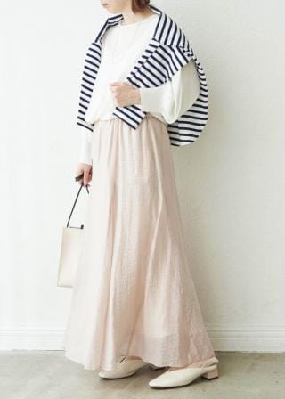 オススメコーデ:フレアスカートやデニムのワイドパンツなど、ゆったりしたボトムと合わせてラフ感を出すのがオススメです◎