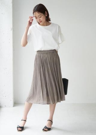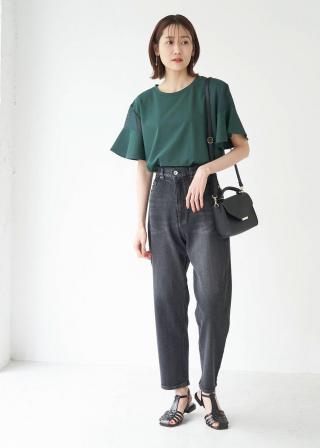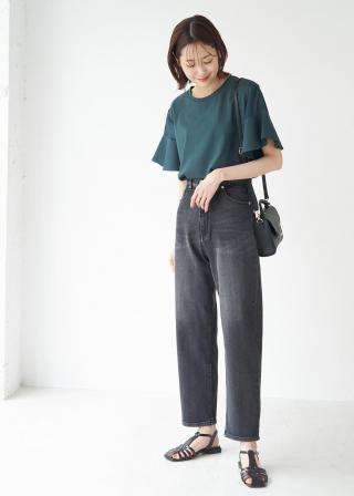 ・二の腕をカバーするフレアスリーブのクルーネックカットソー。