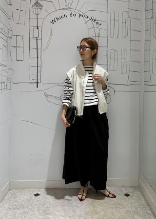 ・ニットベストとのレイヤードでホリデーらしいコーディネートに。