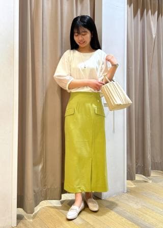 ・長めのプリントスカートを合わせるとフェミニンな春スタイルに。