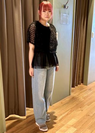 毛足のあるフリンジ素材ですが、透かし編みで涼しく着用できます◎