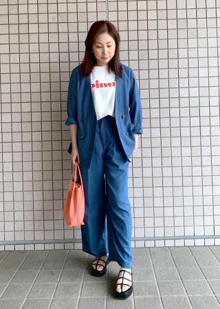 ・ロゴのカラーとボトムのカラーを揃えるとまとまりのあるコーディネートに。
