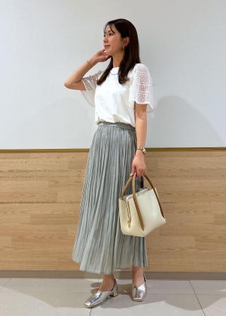 ・落ち感のある上品なスカートと合わせレバ通勤コーデの完成。