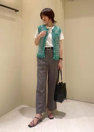 ・ハイライズボトムに裾をインして、トレンドルックが完成。