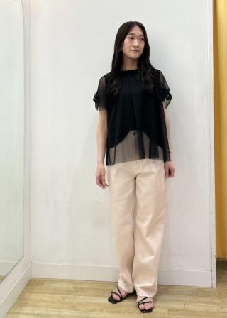 ・やや光沢感のあるなめらかな肌触りのきれいめなカット素材と、目が細かく柔らかなチュール素材を使用。