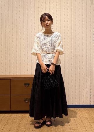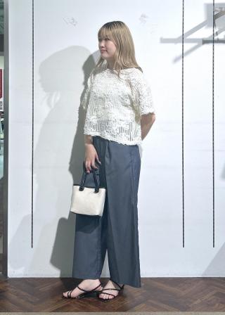 ・花のモチーフと軽やかなメッシュトップスで涼しげで上品な印象に。