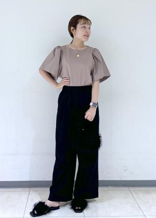 お袖のボリューム感が可愛いきれい見えも叶うカットソーです。お袖は布帛でふんわり広がりの出る生地感です。身頃は滑らかな質感のカットソーなので、肌触りも良く着心地も良いです。