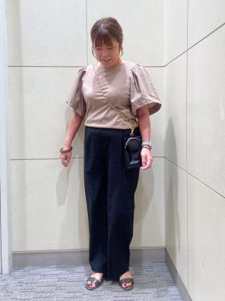 布帛素材のボリュームスリーブがポイントのブラウス感覚で着られるデザインカットソーです。