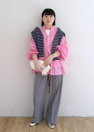 襟ぐりが広めなので、シャツやブラウスをレイヤードしてもかわいい!