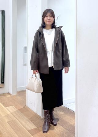 ・アウターはショート丈ジャケットを羽織り、ペプラムのデザインを活かしたコーディネートがおすすめ。