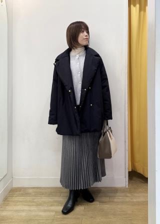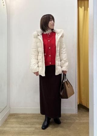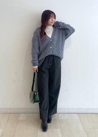 ・毛足感のある素材なのでフラットな素材のアイテムと合わせて抜け感のある大人コーデに。