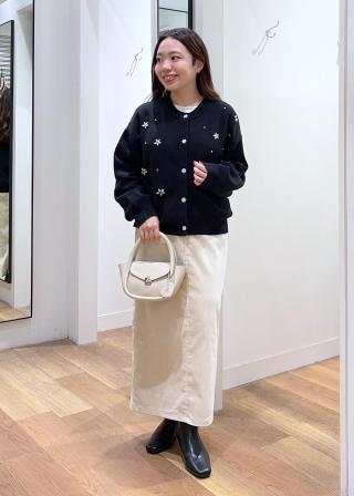・Iラインシルエットスカートにブーツと合わせると落ち着いたカジュアルスタイルに。