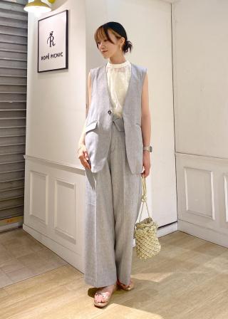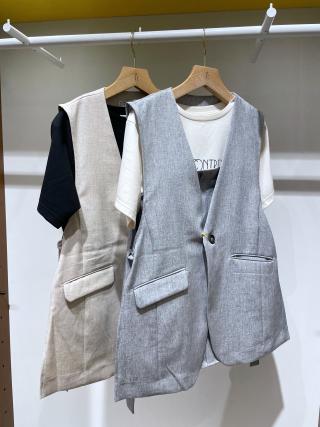 ・麻のナチュラルな風合いを活かした、シャンブレー素材のジレ。