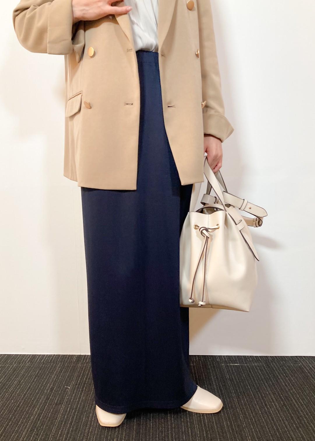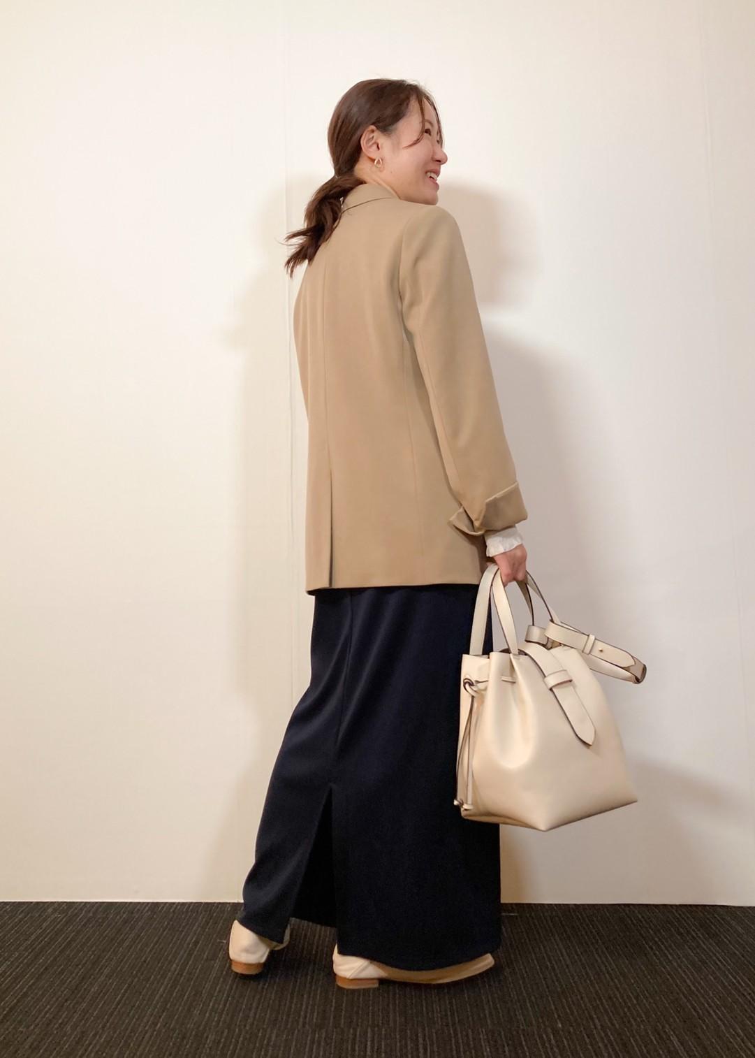 ジャケットをスカートとブラウスでレディに着こなしました。