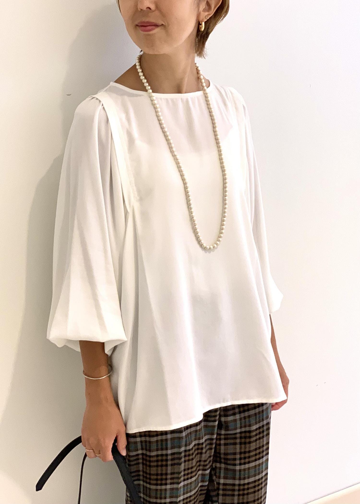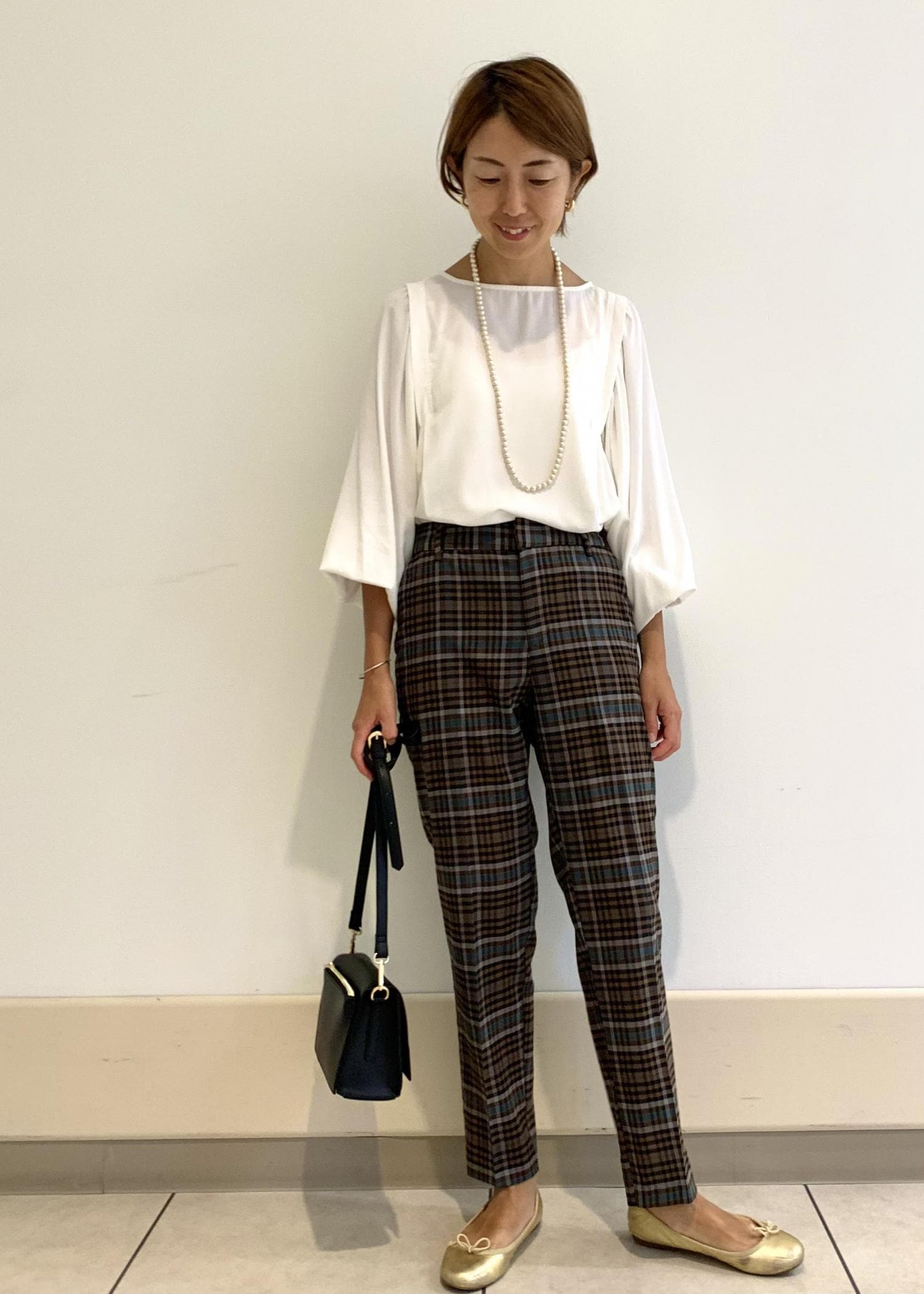 秋の始まりにチェック柄のテーパードパンツはいかがでしょうか…? いつもブラウスに合わせるだけで、秋の先取りコーディネイトが楽しめます。