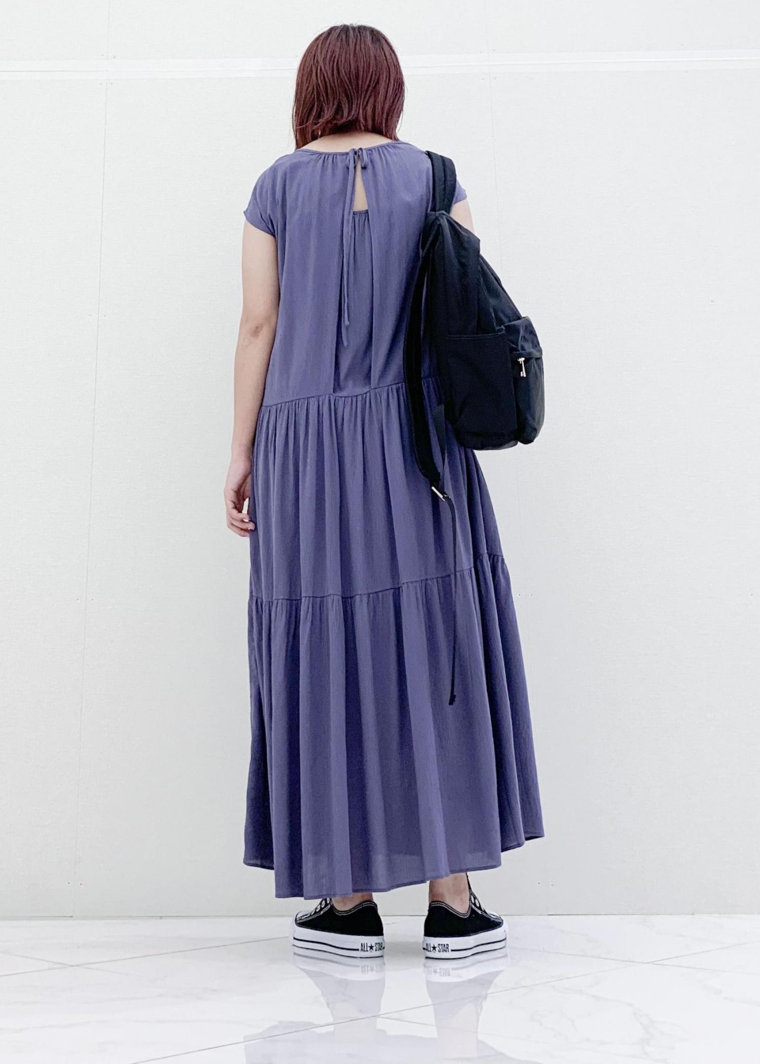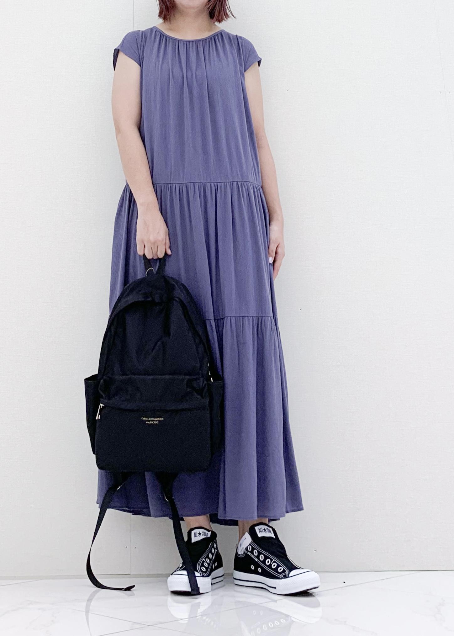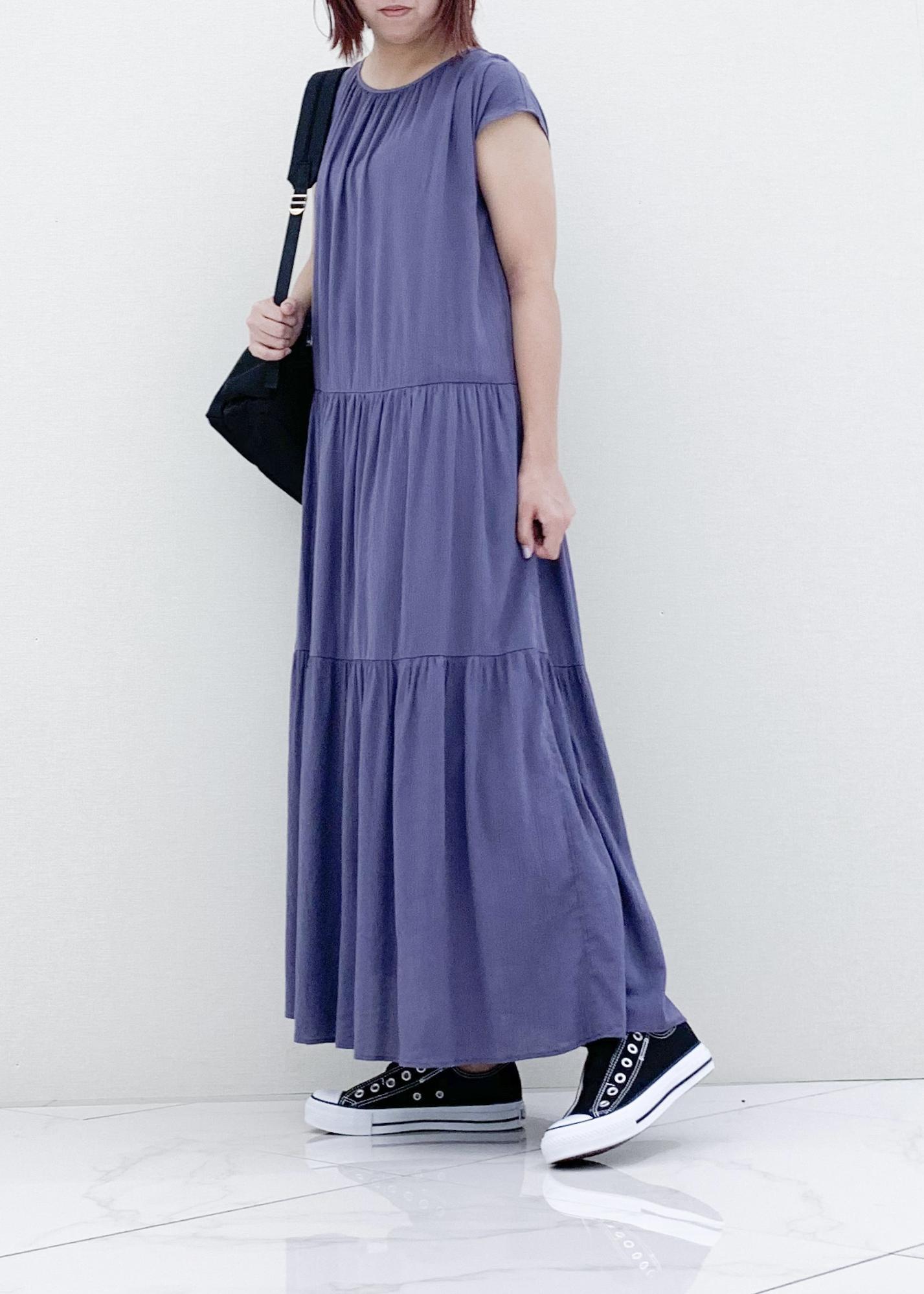 リラックス感のあるマキシワンピースをカジュアルダウンしたコーディネートにしました。