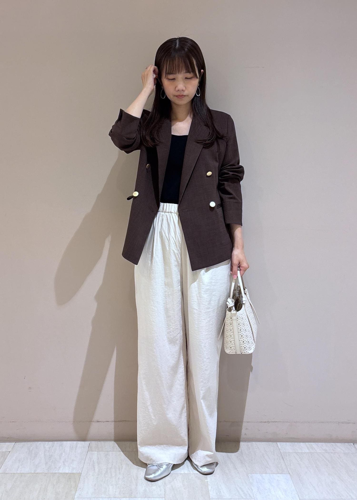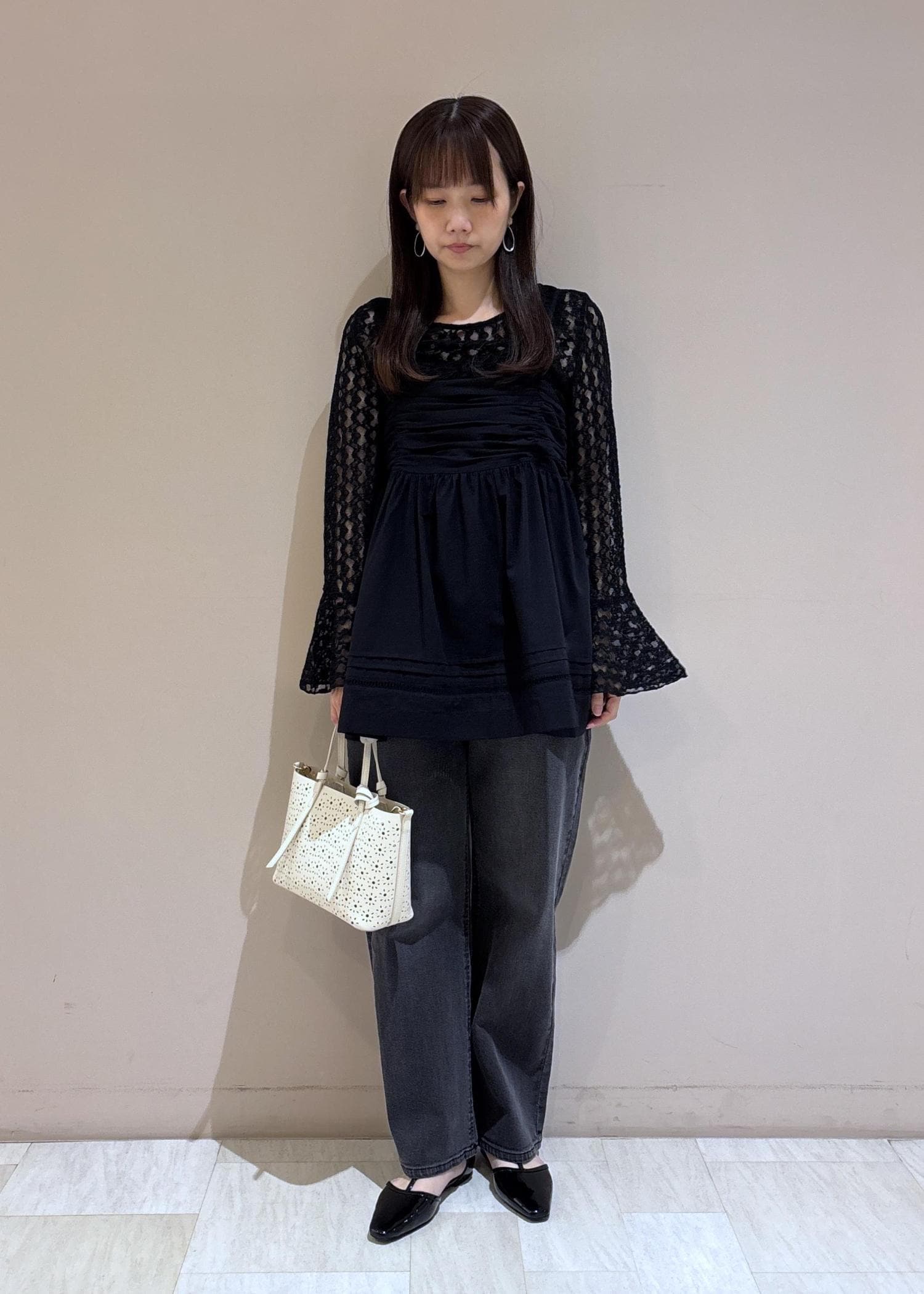 フリルがポイントのシンプルブラウスにベイカーパンツを合わせて大人っぽいスタイルに。 パンツはゆったり楽ちんです♪