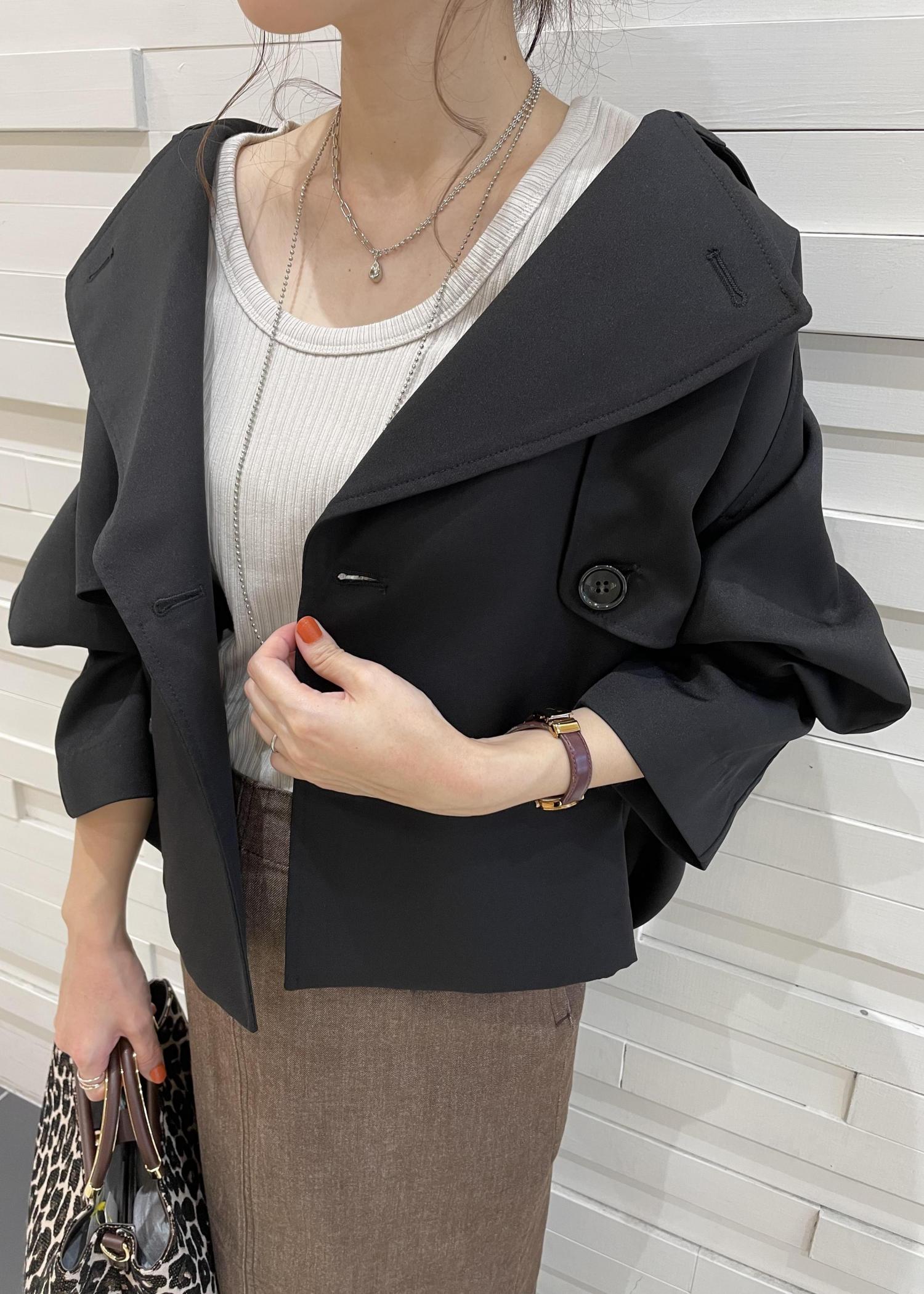 ショートトレンチコートはルーズ感はありますが着丈がコンパクトなのでバランス良く着て頂きやすいです。着丈の長いワンピースやボリュームのあるスカート、パンツにも◎!!