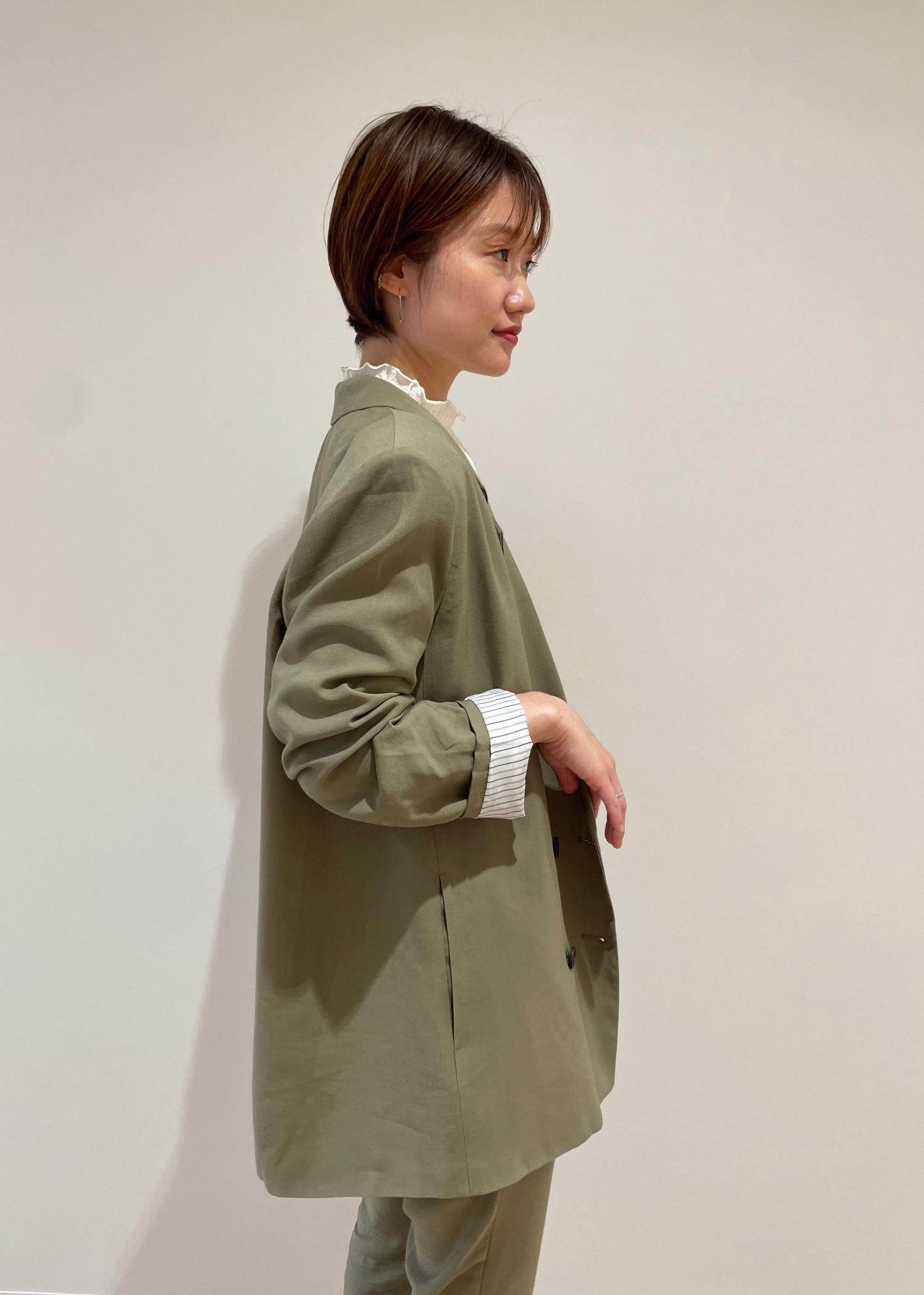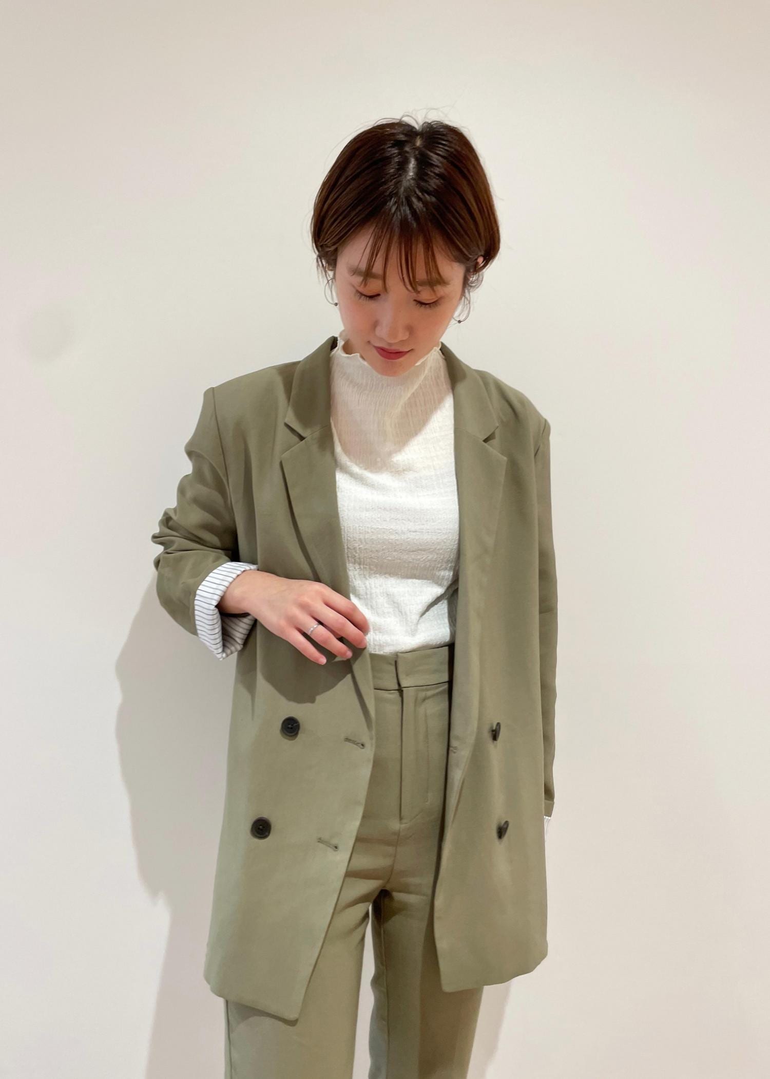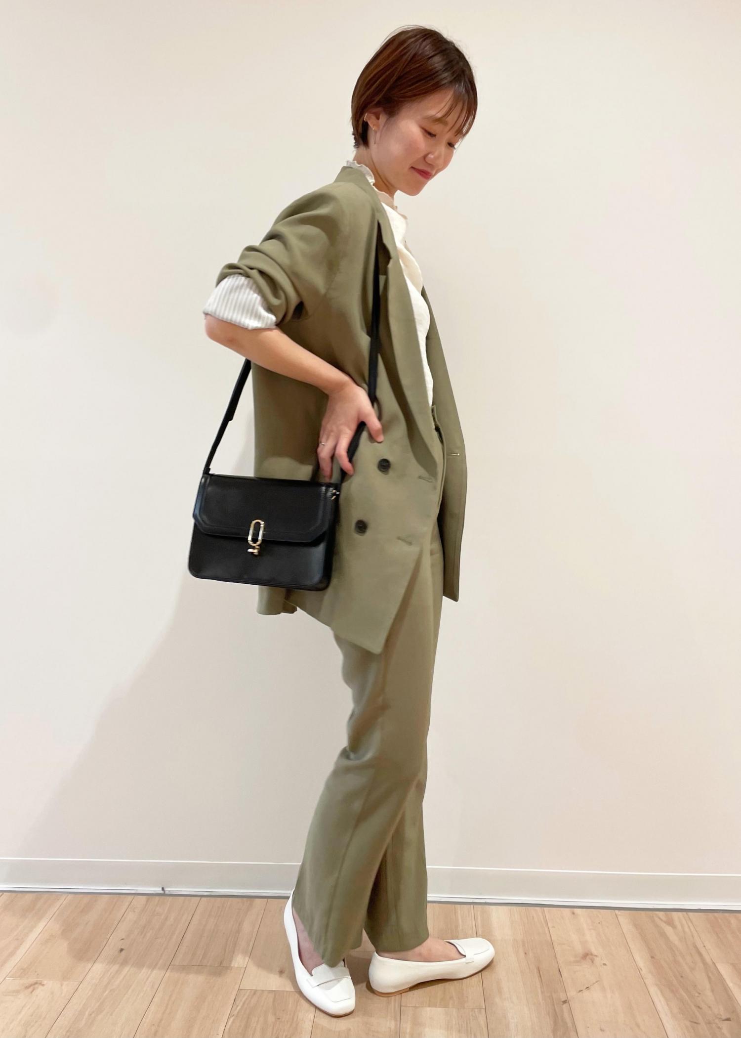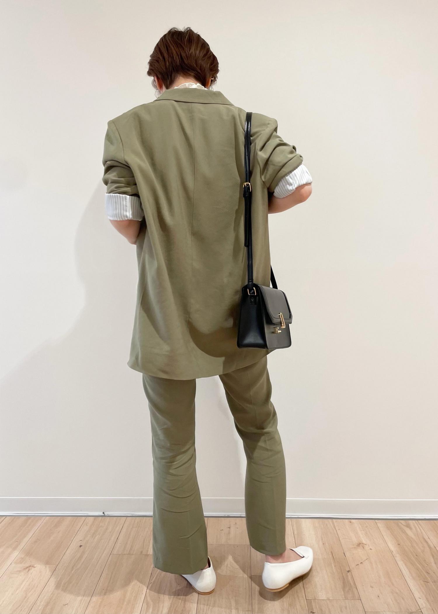 ジャケットとパンツのセットアップで コーディネート♩ 一見、メンズライクなコーディネートですが 腕まくりや浅めのパンプスで 少し肌見せしてヘルシーに 仕上げたのがポイントです。 腕をまくると裏地も可愛くおすすめですよ。