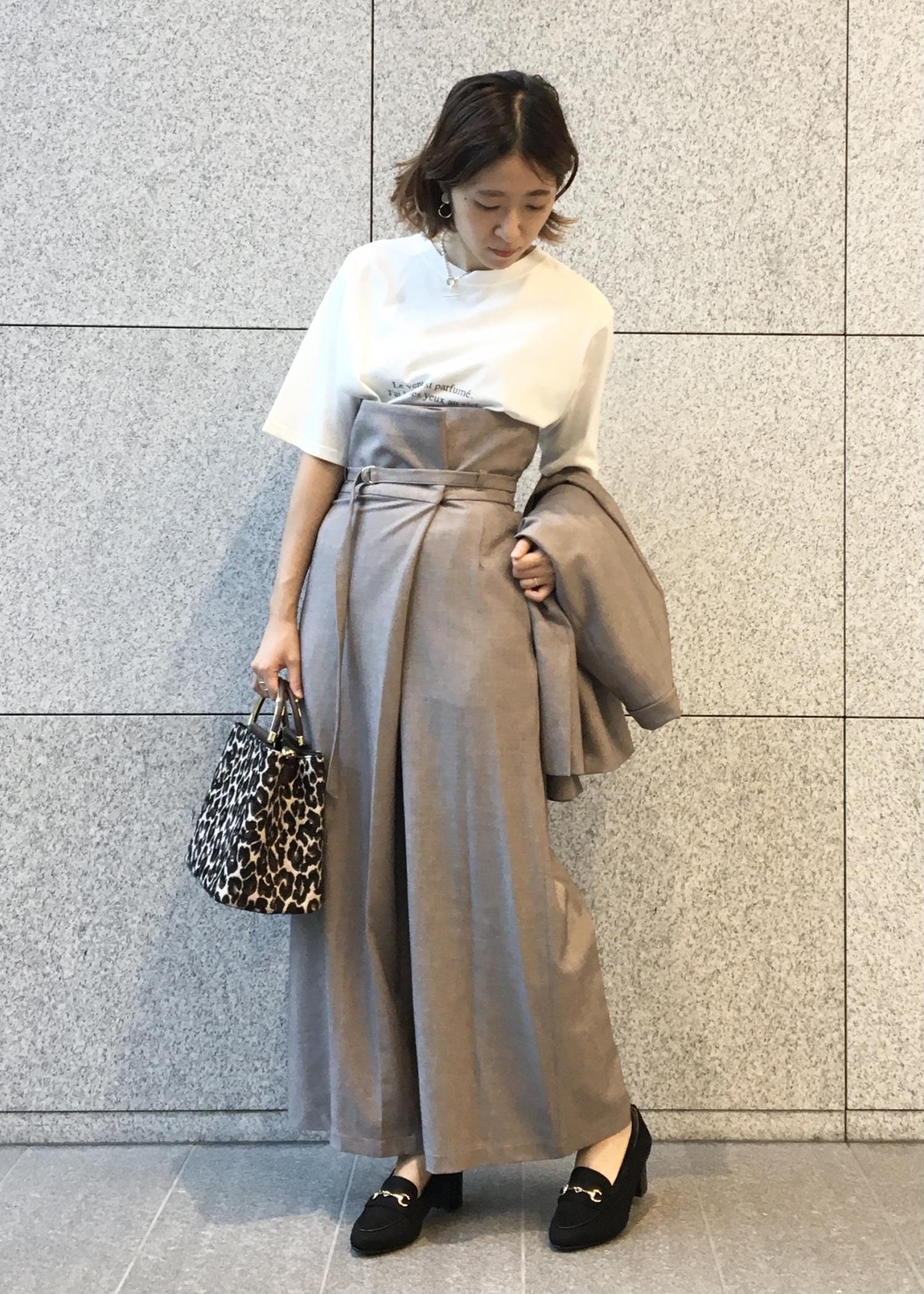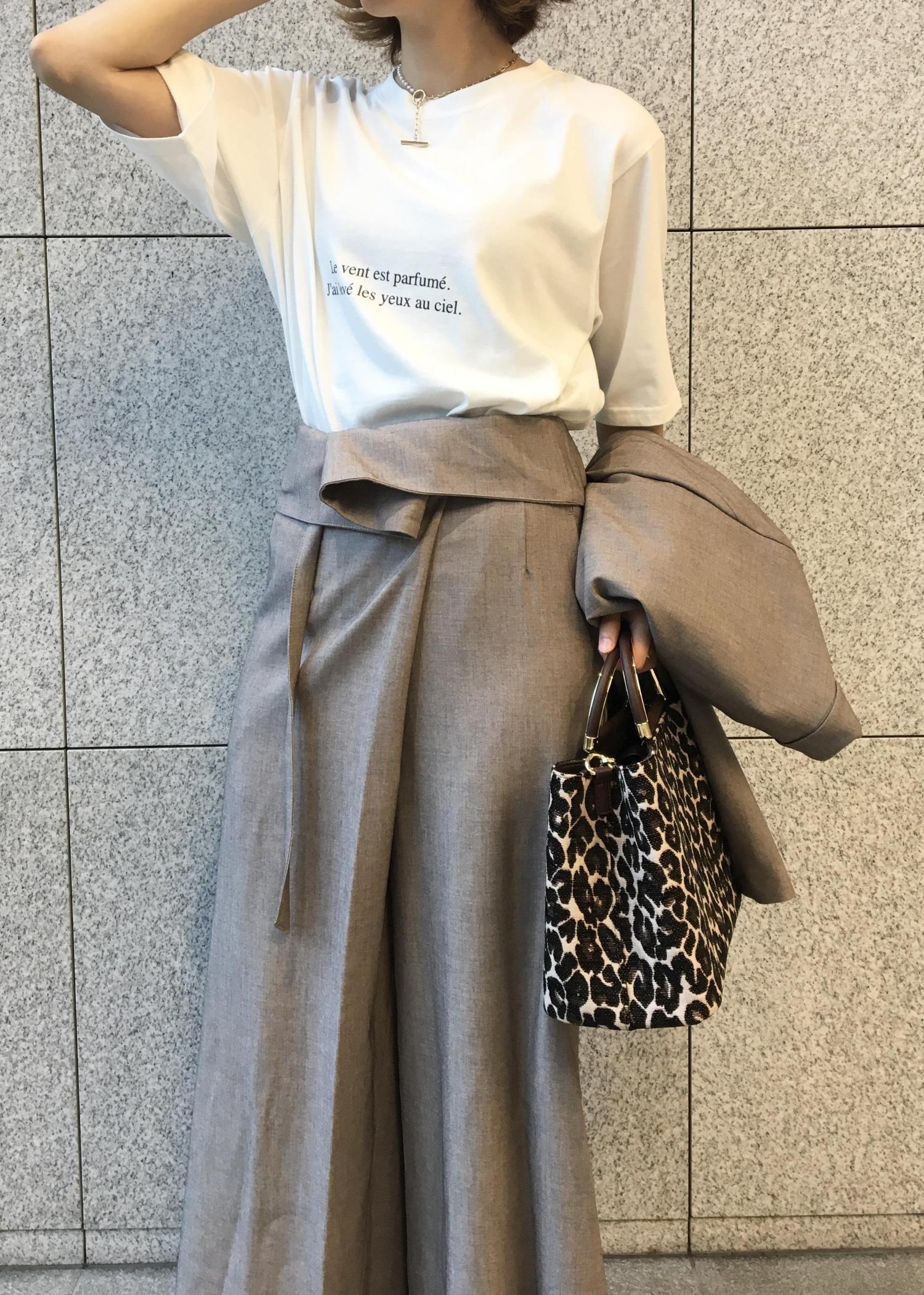 ハイウエストのカシュクールパンツとダブルボタンのジャケットのセットアップで定番でも今年らしい印象に。
