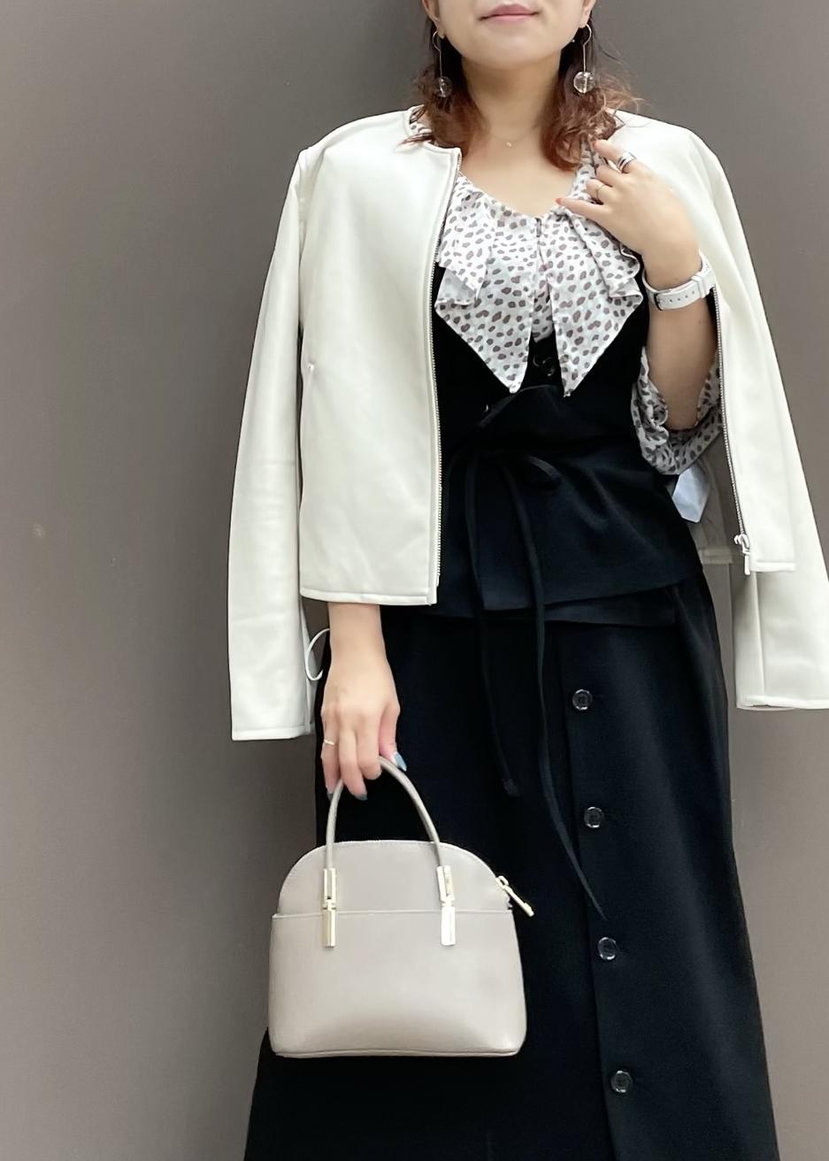 低身長に見えないウエストマークのワンピースを柄ブラウスと合わせて、大人のお出掛けコーデにしました♪ 色は全体に抑えているので、お顔元の柄が華やかに見えて明るい印象にしてくれます・:*+. そろそろ涼しくなってきたのでアウターもお勧めですー!