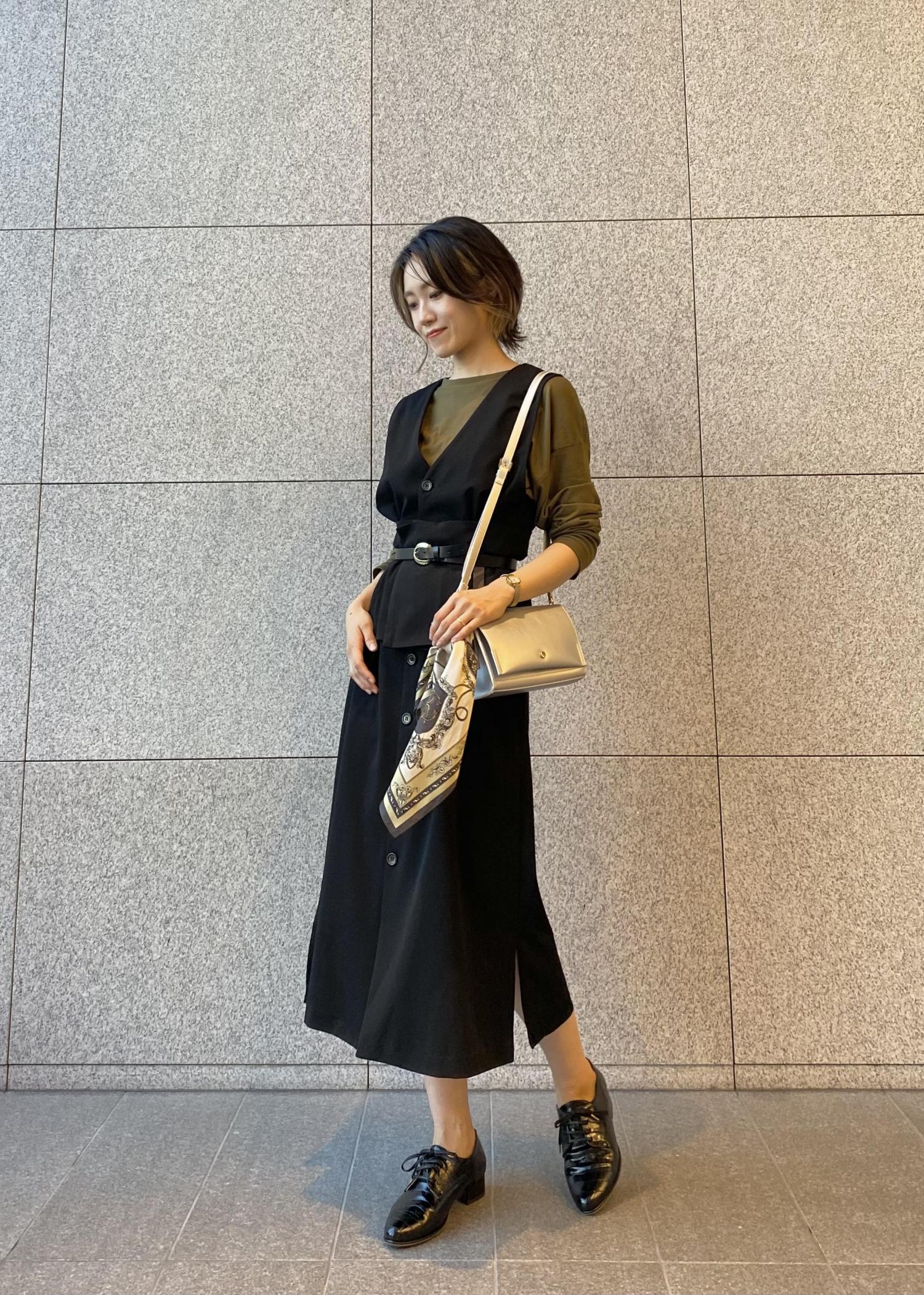 カーキ×ブラックがシックでおしゃれなジャンスカコーデ。シルバーバッグやスカーフをアクセントに、女性らしく上品な小物で大人な印象に仕上げました。