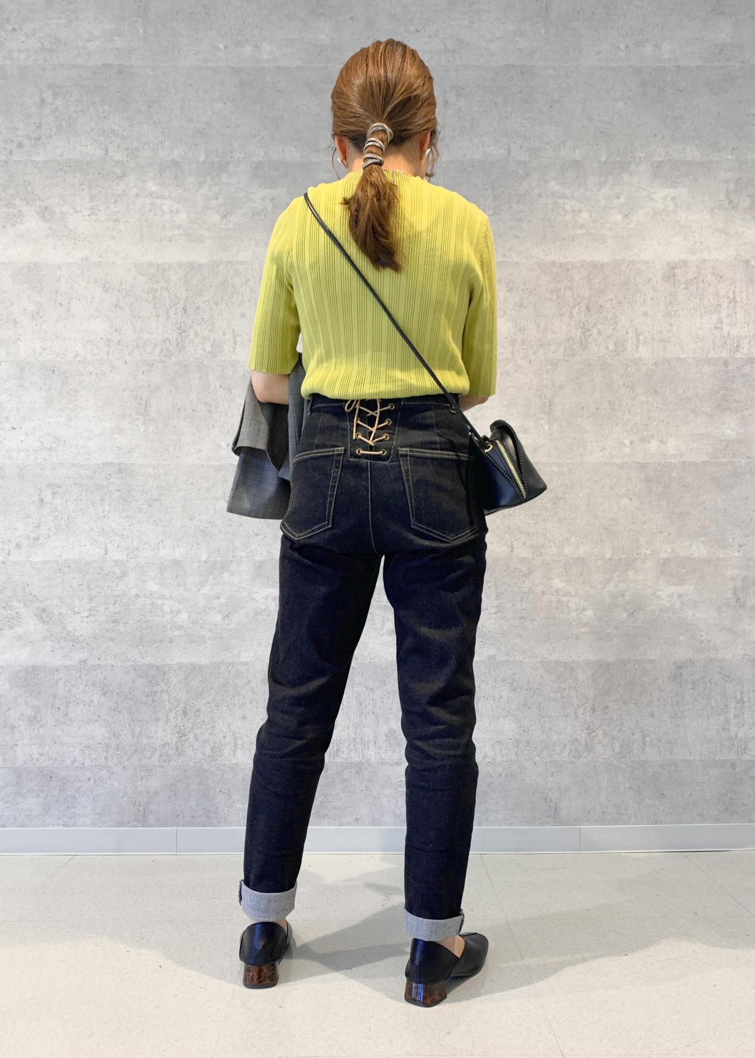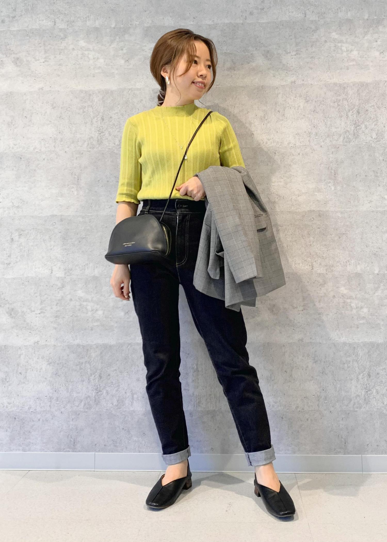 トップスにピスタチオカラーを取り入れることで、ジャケットを脱いでも地味な印象にならない様にしました。