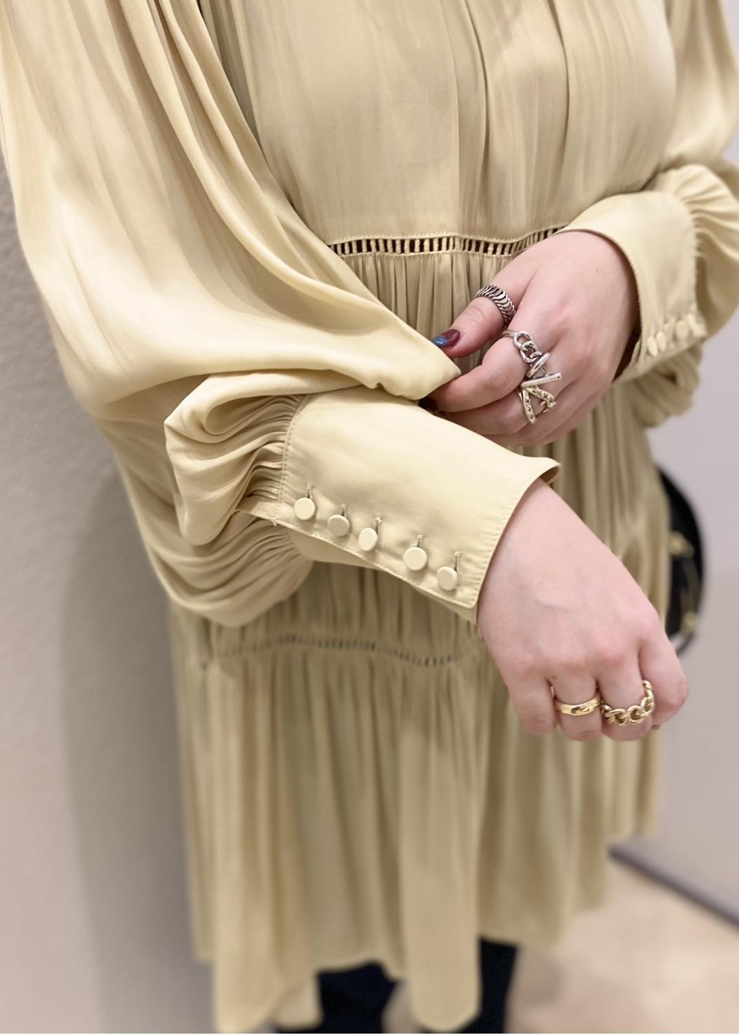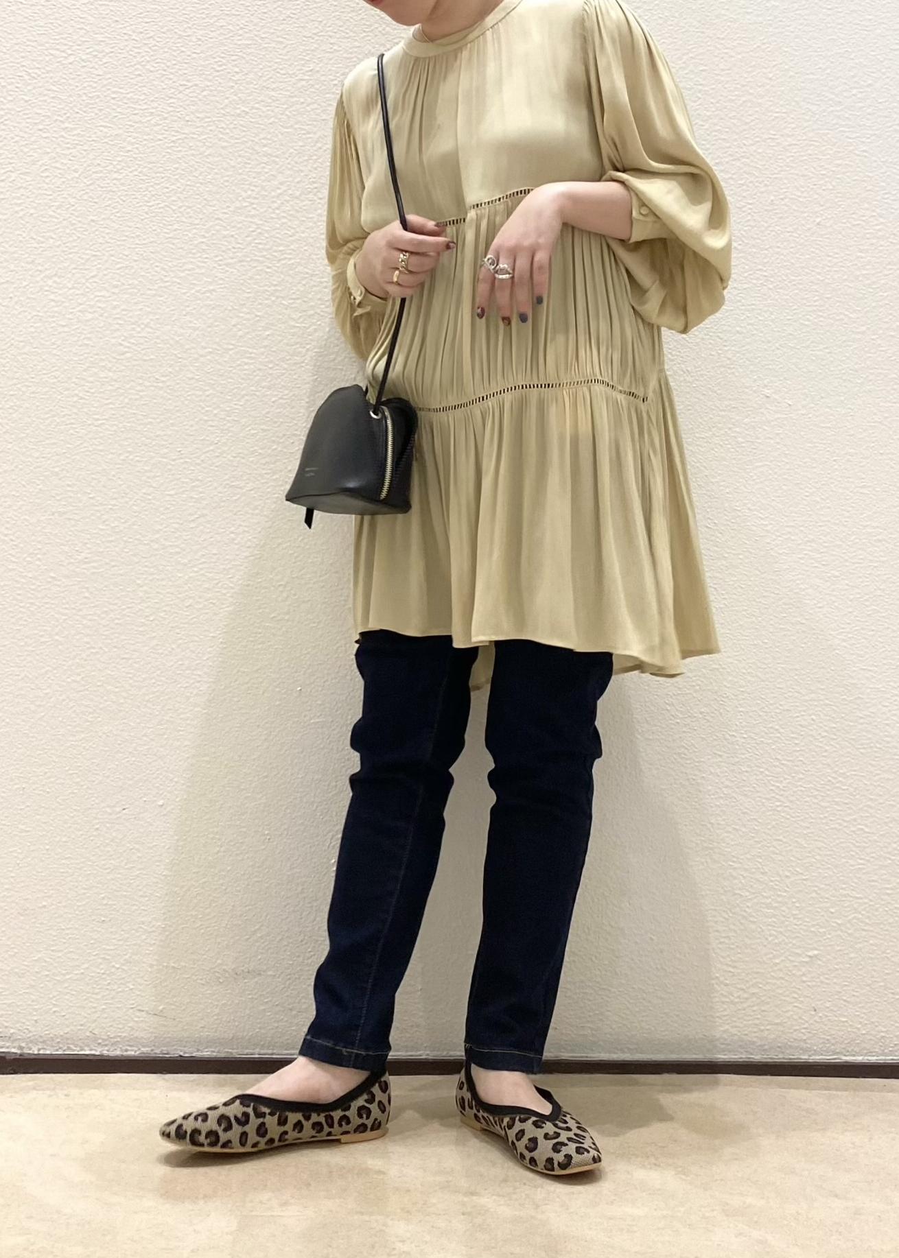 袖のボリュームたっぷりなチュニック丈なのでボトムをスキニーデニムで合わせてメリハリのあるスタイルに♩