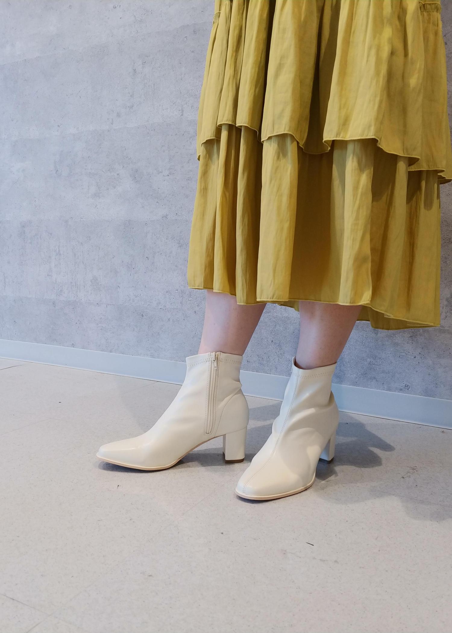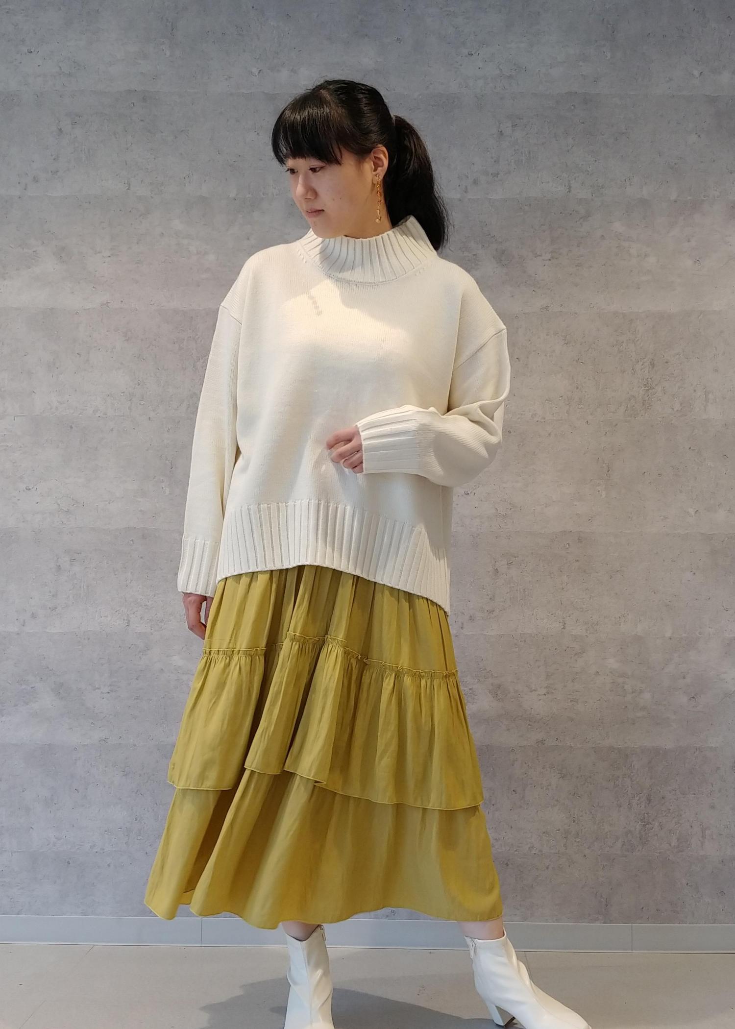 ハイネックのニットに秋色スカートを合わせ、足元はブーツにしてみました。白とイエローで明るい印象にしました。