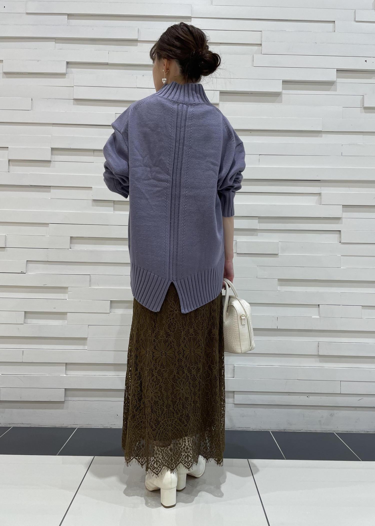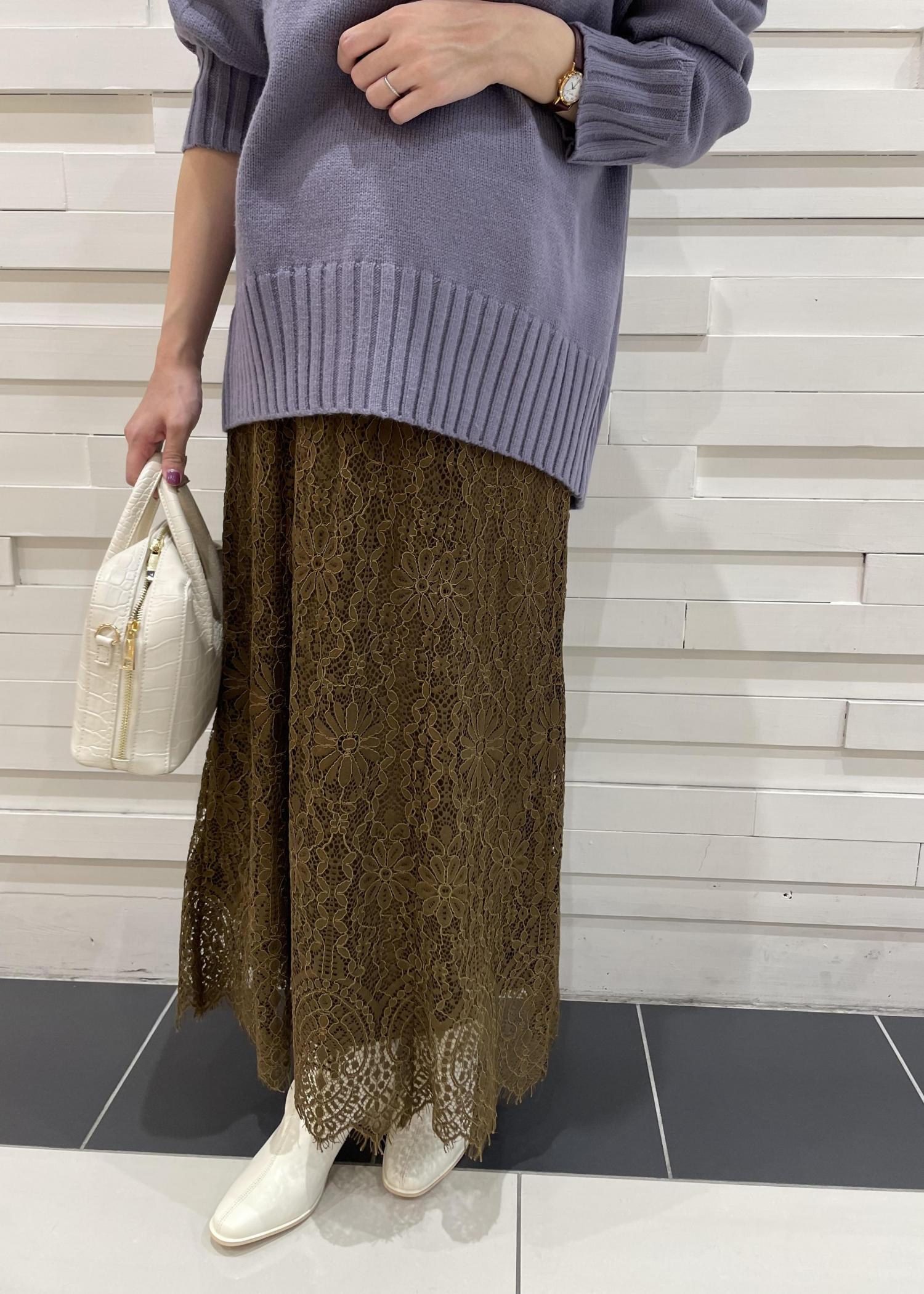 パープルのニットに、抑え目のカーキのカラースカートを合わせました。スカートは総レースで、落ち着いたカラーコーデの中にも大人っぽく、女性らしく仕上げました!