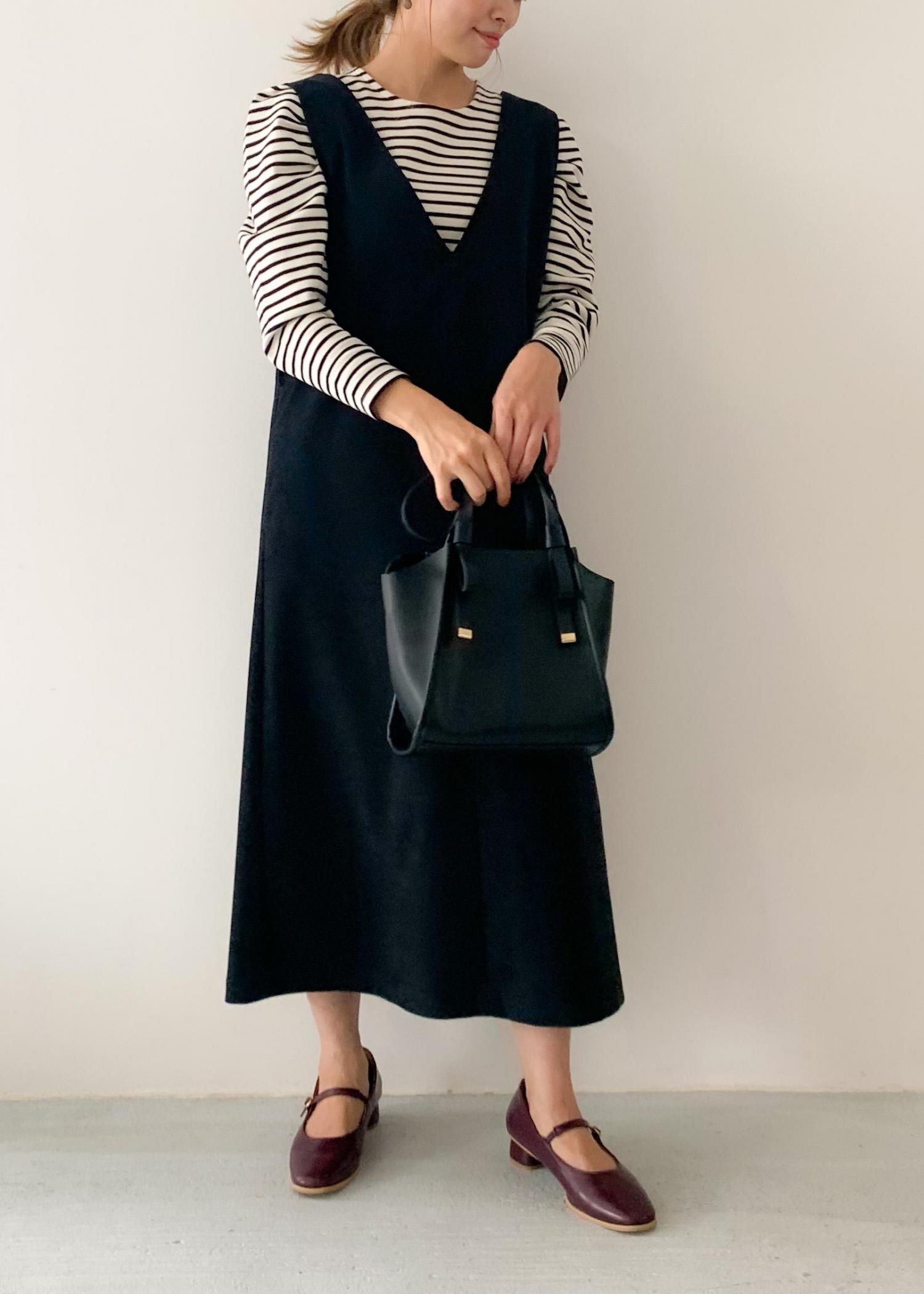 ノットが可愛い軽い鞄を合わせて、クラシカルなスタイリングです。