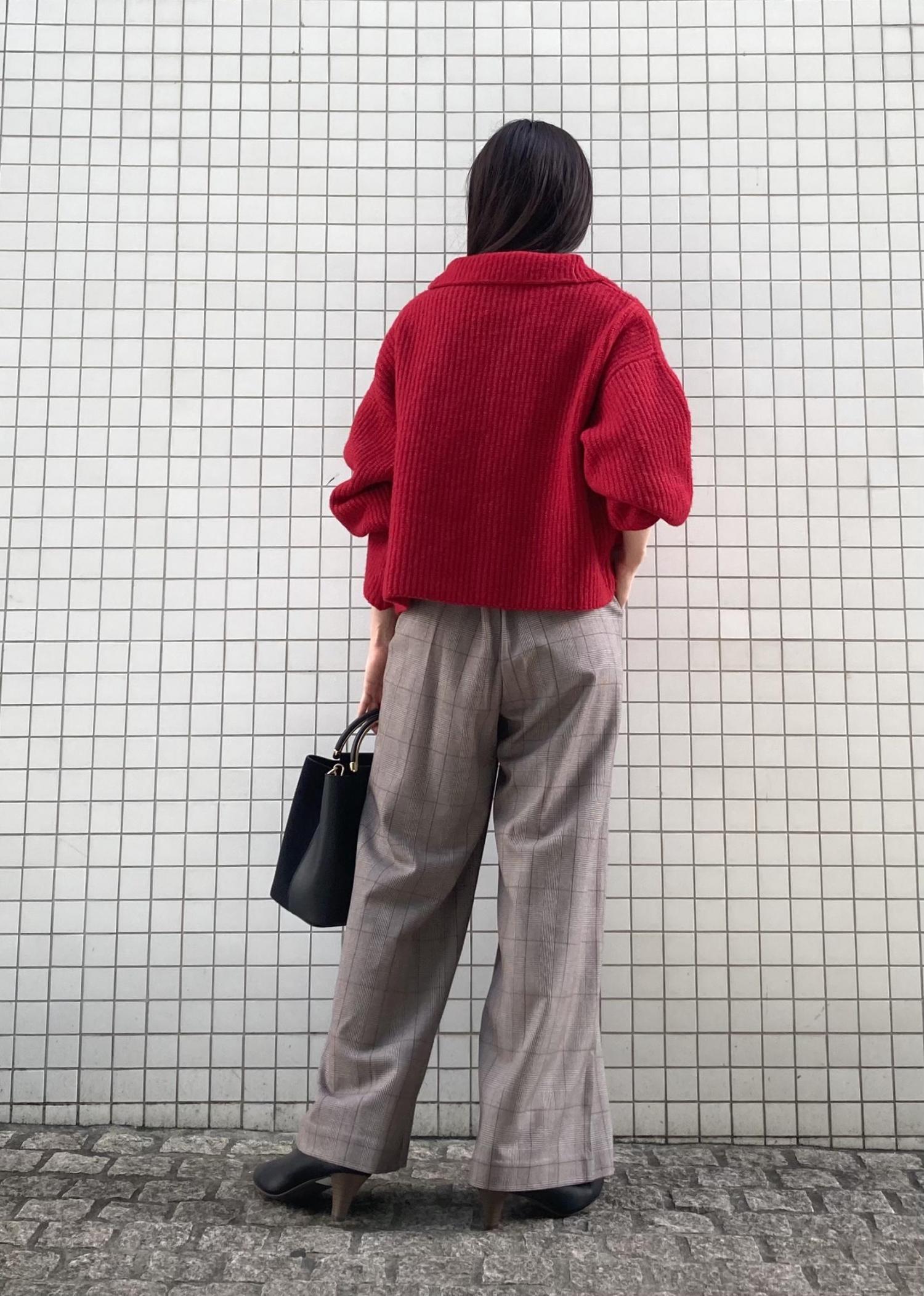 カラーがはっきりしたトップスなので、小物はブラック。パンツは中間のブラウン系で柔らかさをプラス。