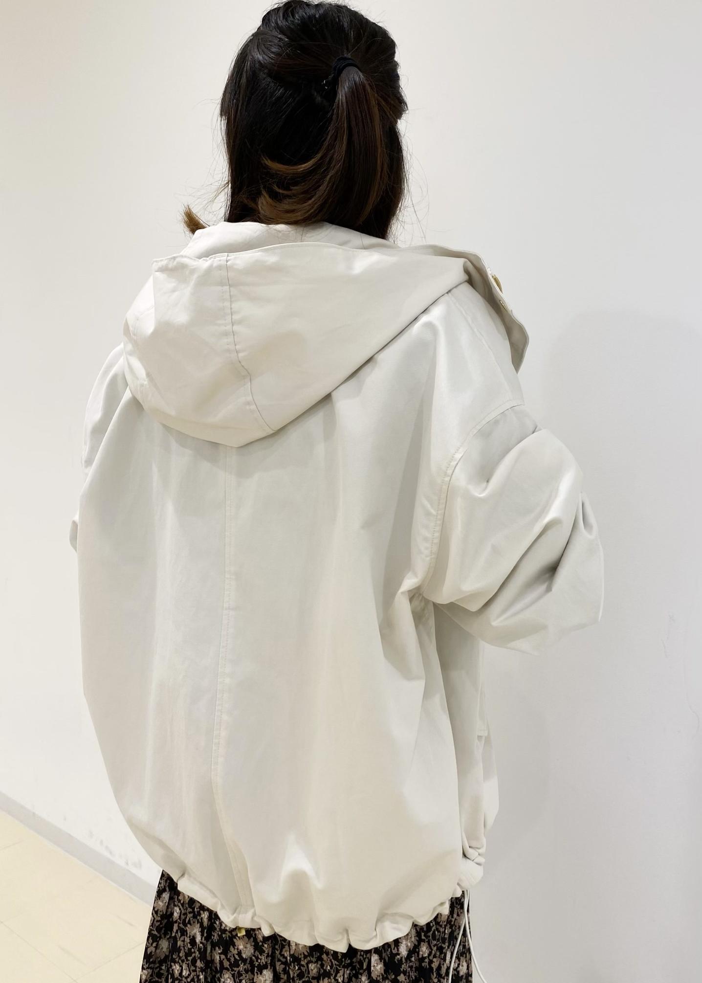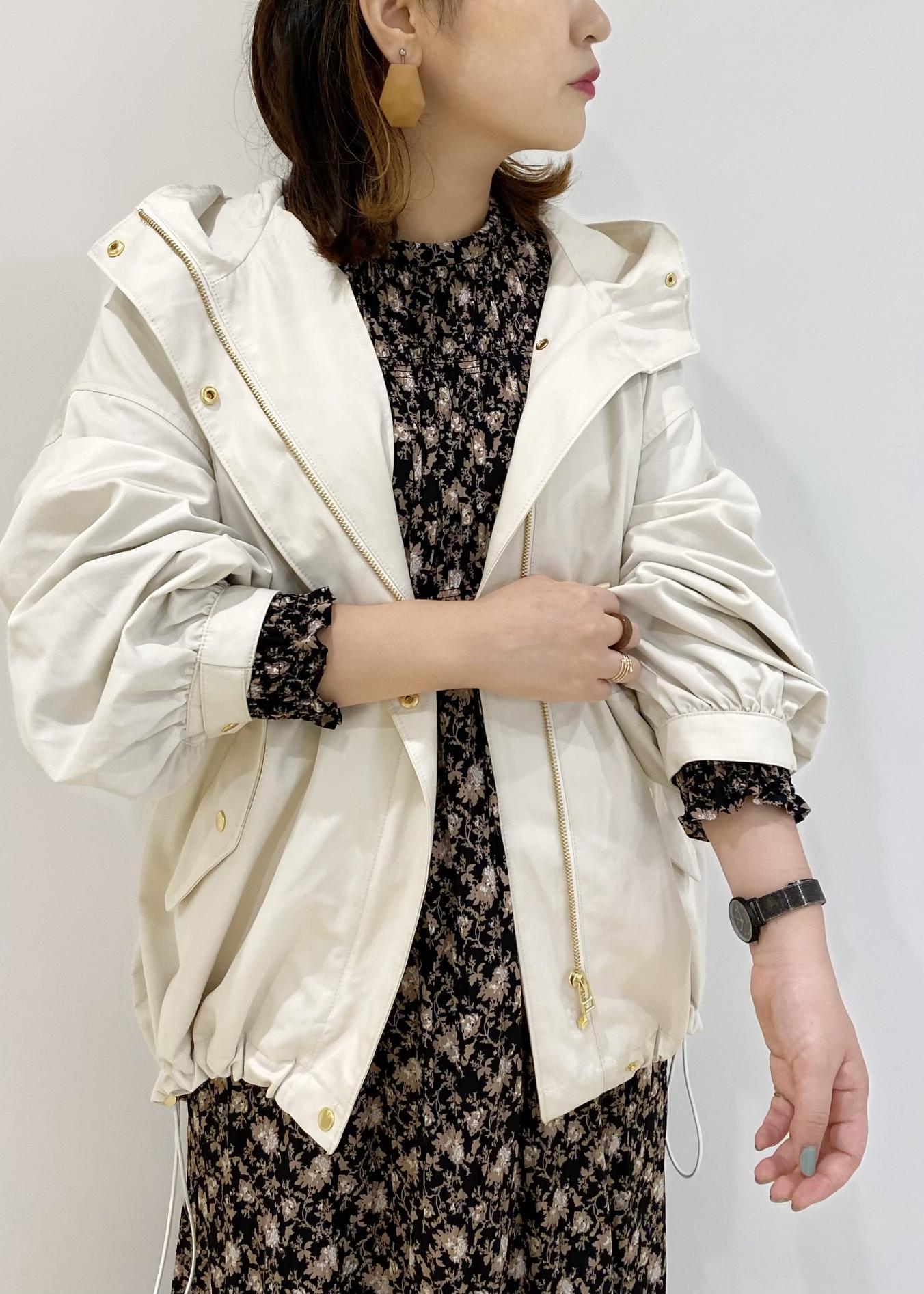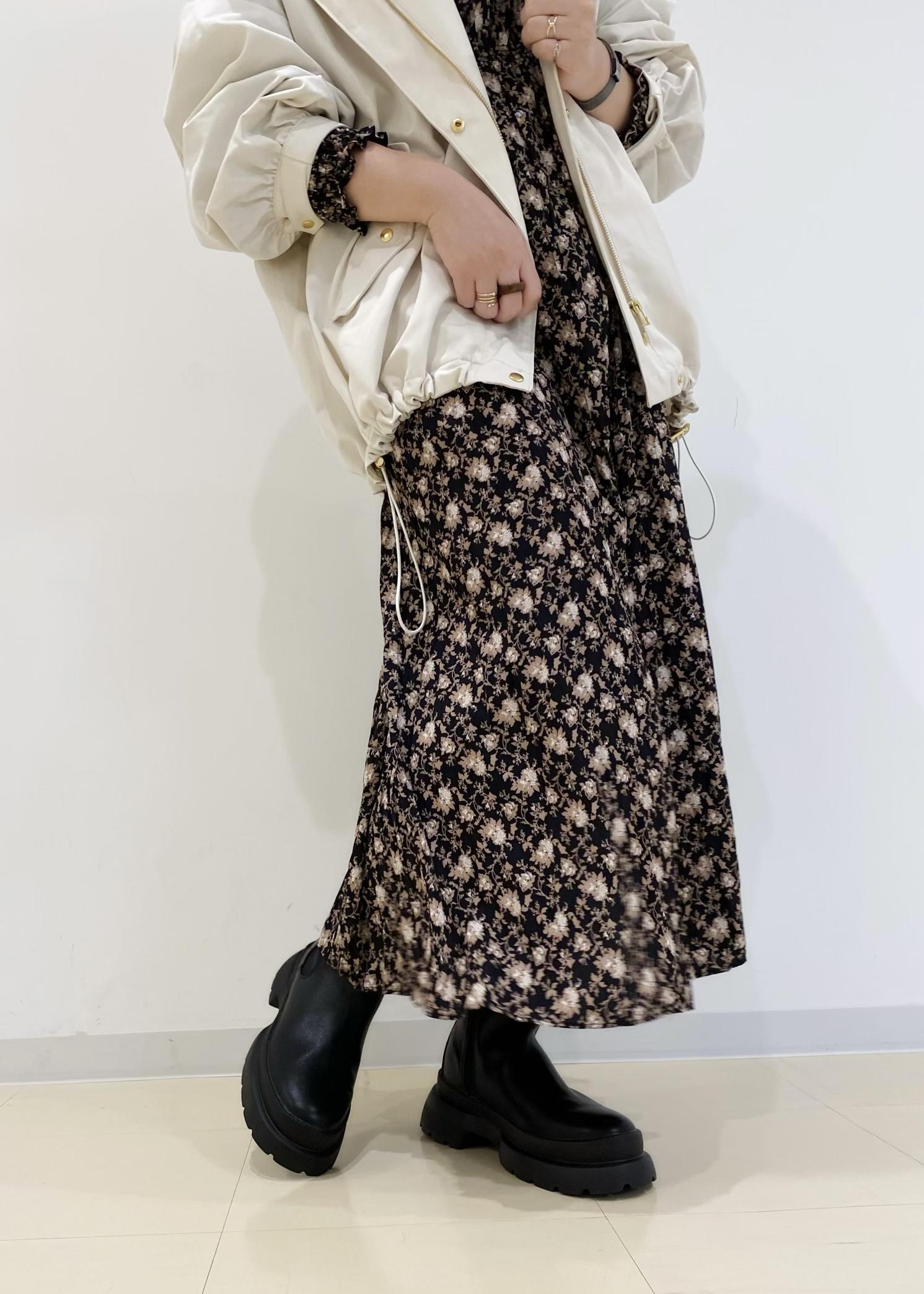 黒ベースの柄ワンピースに明るいキナリのマンパを合わせ、重くなりすぎないように工夫しました。