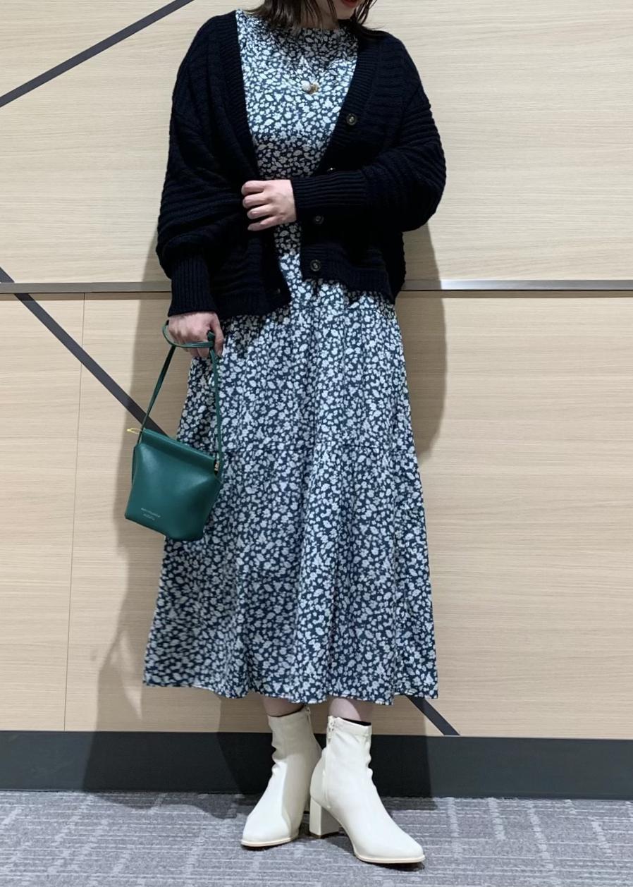 華やかなフリルやモダンなボリュームスリーブが印象的なワンピースと、ショート丈のニットカーディガンです。
