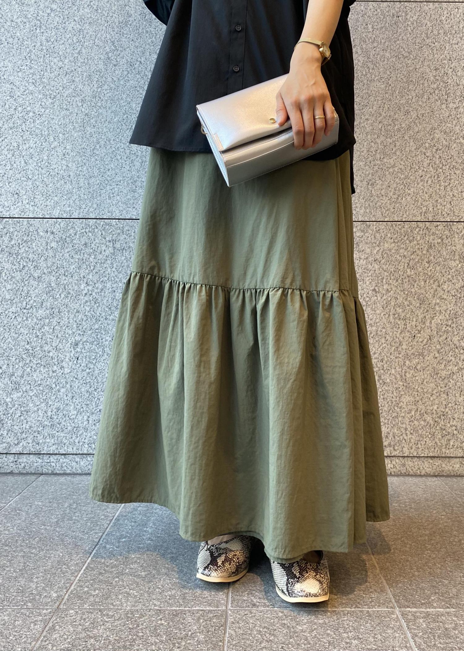 ブラックでシックに合わせカーキのロングスカートでカジュアルダウンしました。