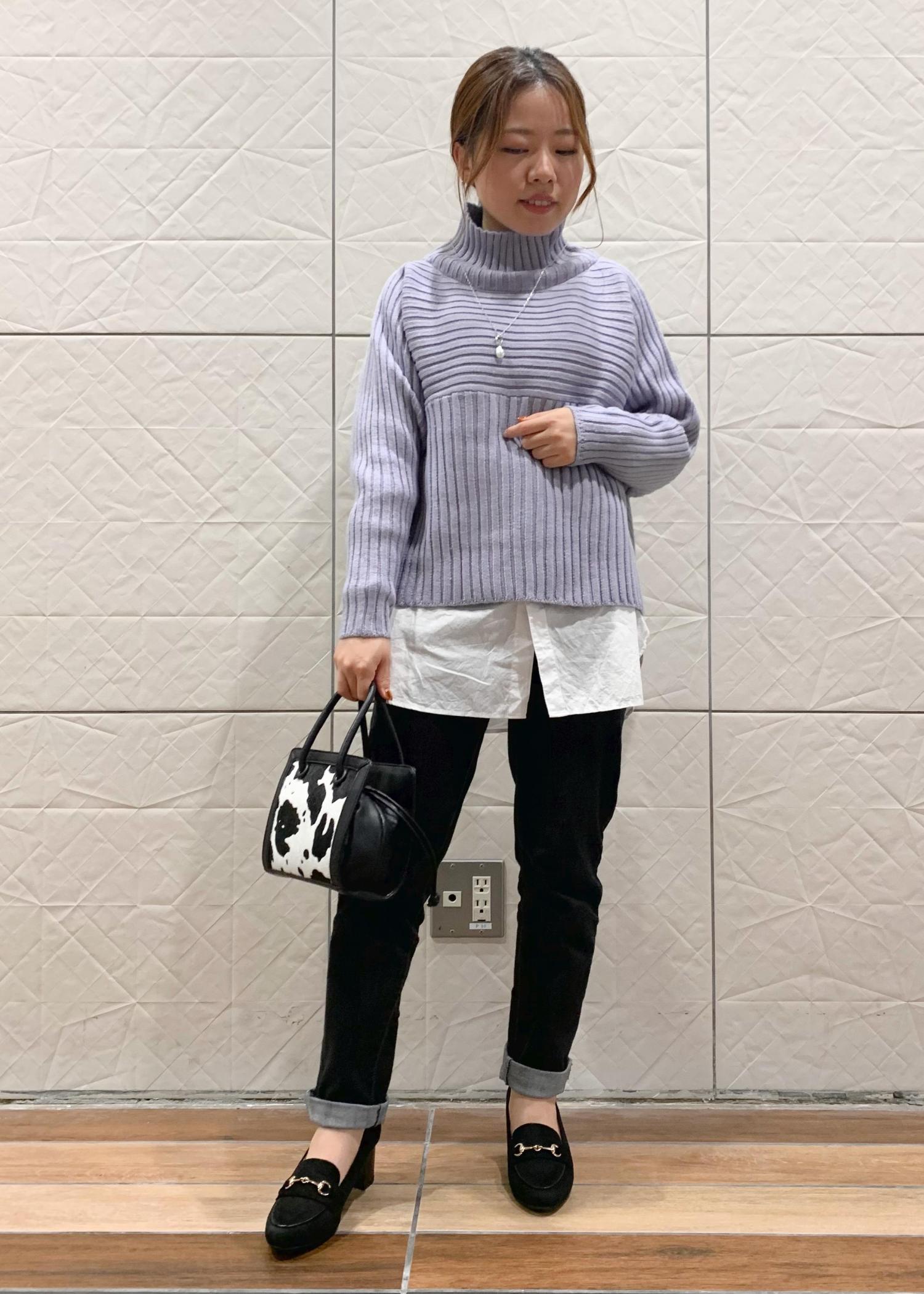 キレイなくすみカラーのニットが引き立つ様、他のアイテムはモノトーンでまとめました。アニマル柄のバッグを合わせて、コーディネートのアクセントに◎