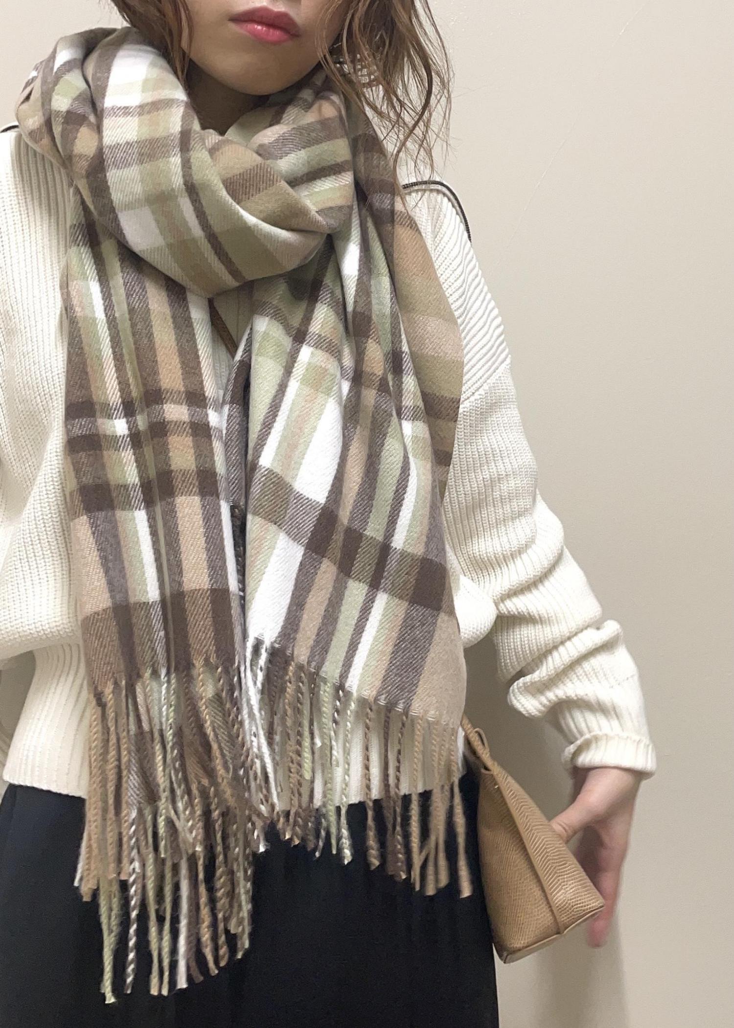 シンプルなコーデのポイントにこれからの時期大活躍のチェック柄のストールをプラス♪