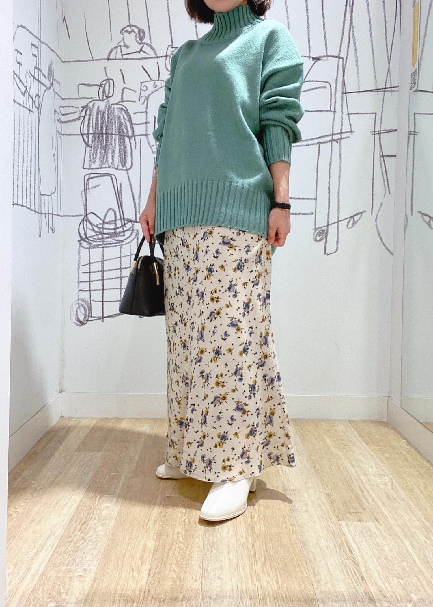 グリーンのカラーニットが秋冬らしいコーディネイトです。 大きめのニットなのでシルエットのきれいなマーメイドスカートと合わせました!