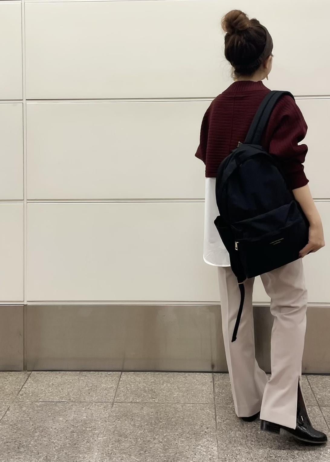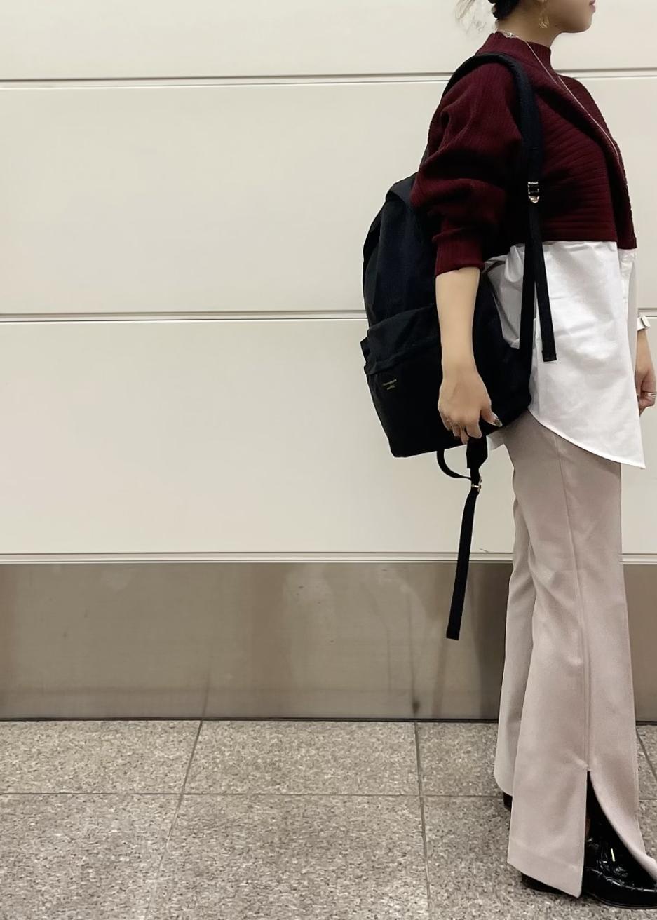 レイヤード風ニットは秋の定番ボルドーで、合わせるカラーパンツはピンク系で同系色にして煩くならないカラーコーデにしました☺︎