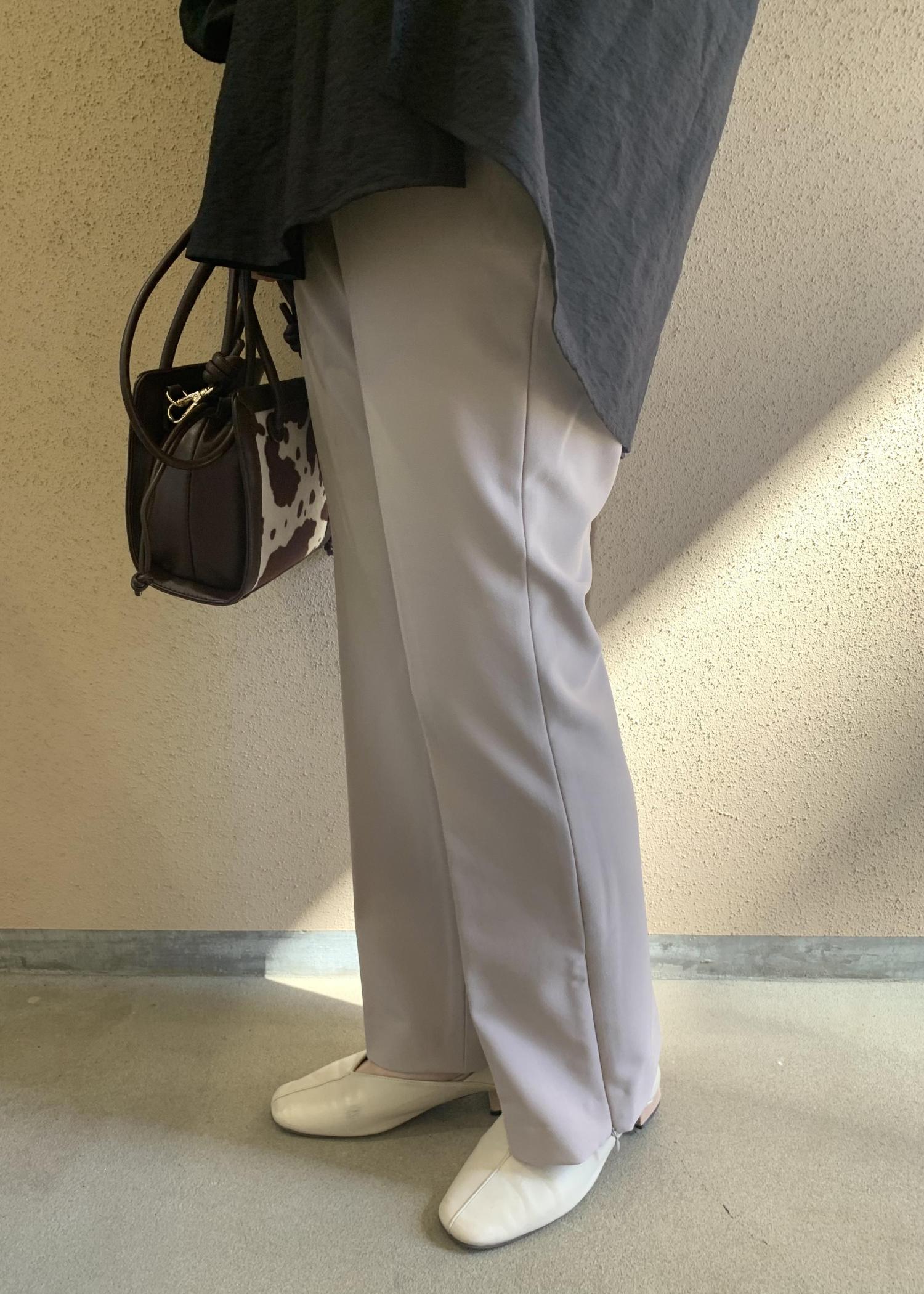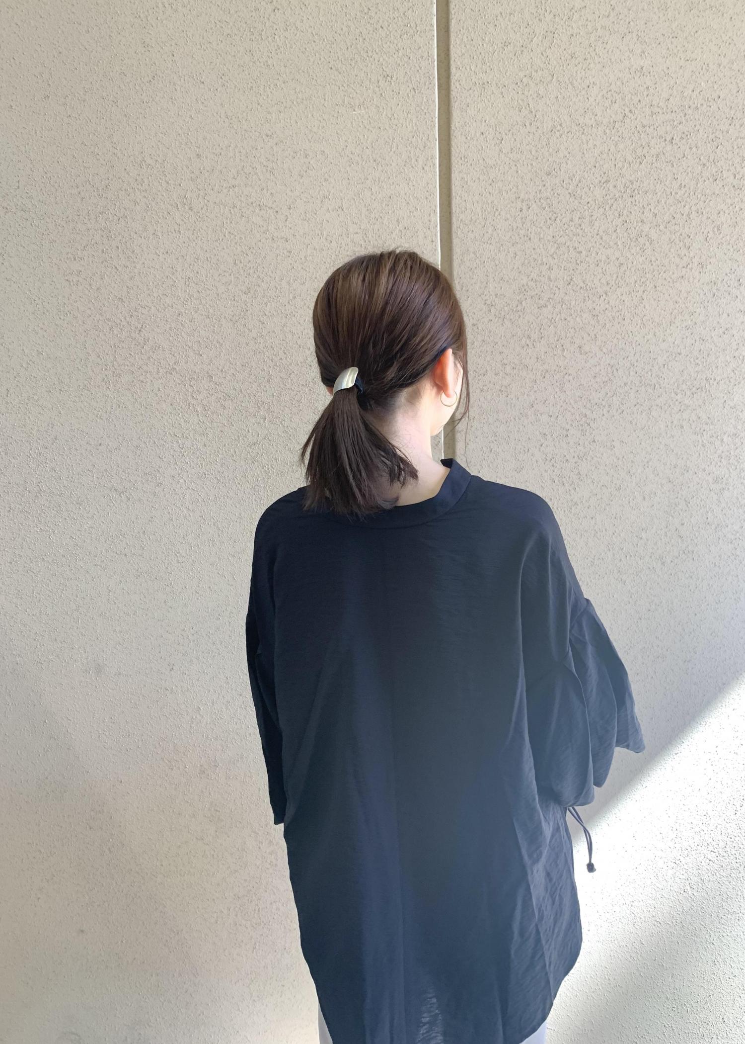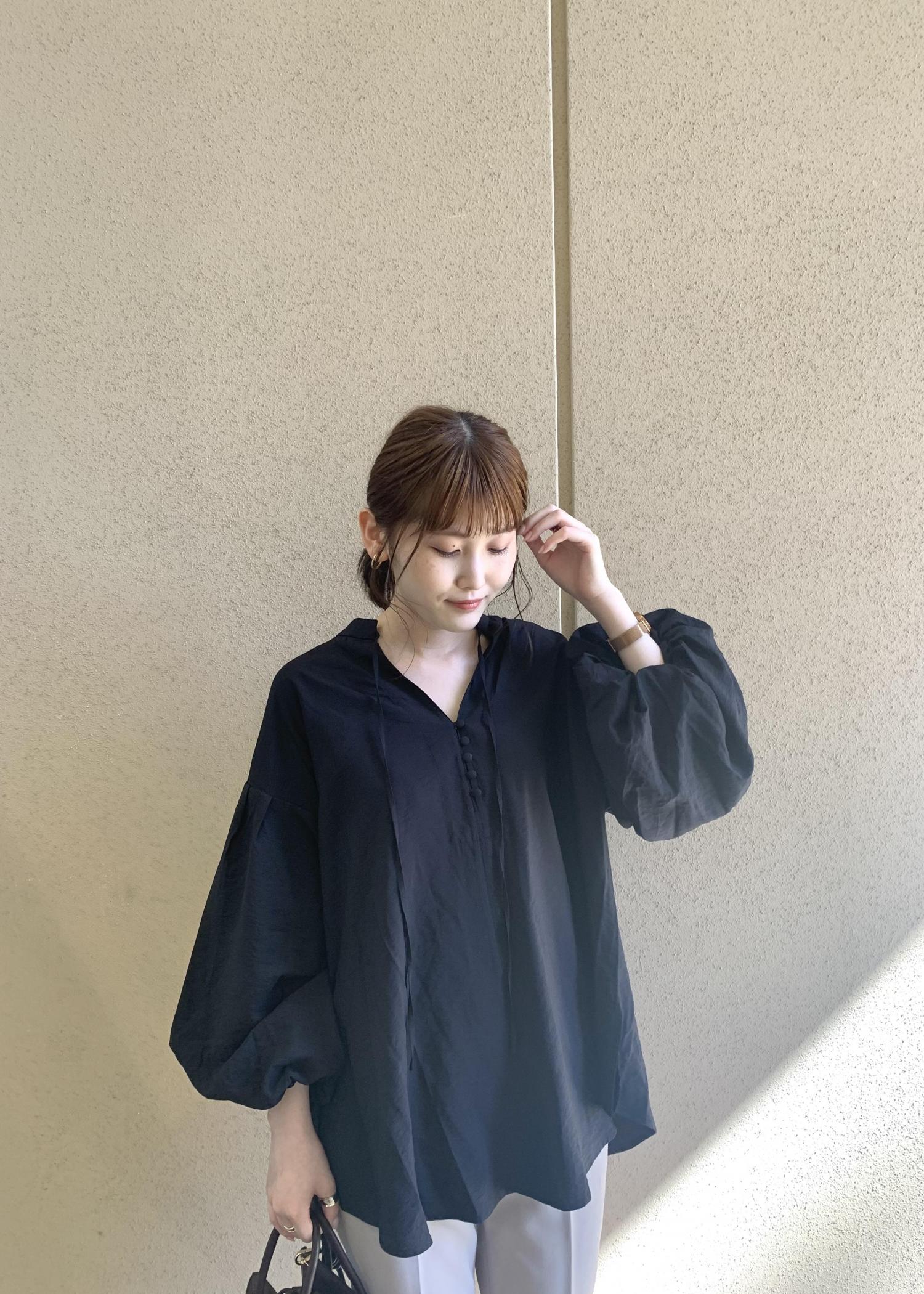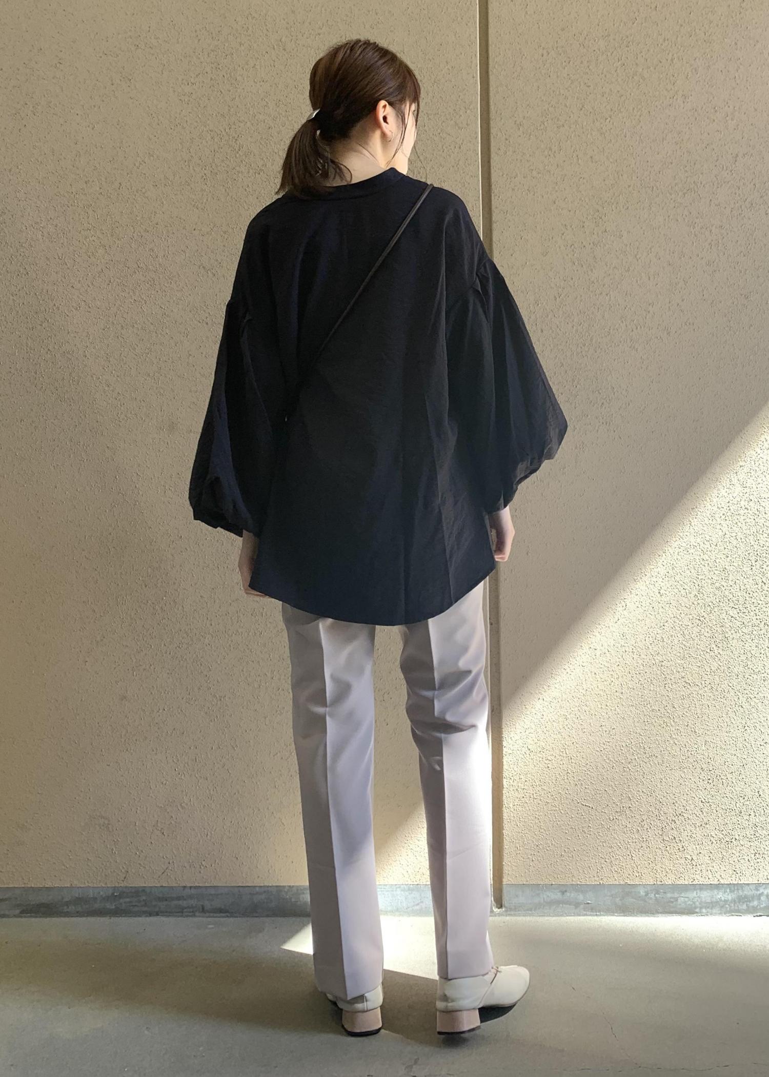 ボリュームのあるブラウスにフレアパンツを合わせたスッキリ見えコーデ。 普段黒を着ない私ですがこちらは柔らかい素材やシアー感で抵抗なく着用できました。