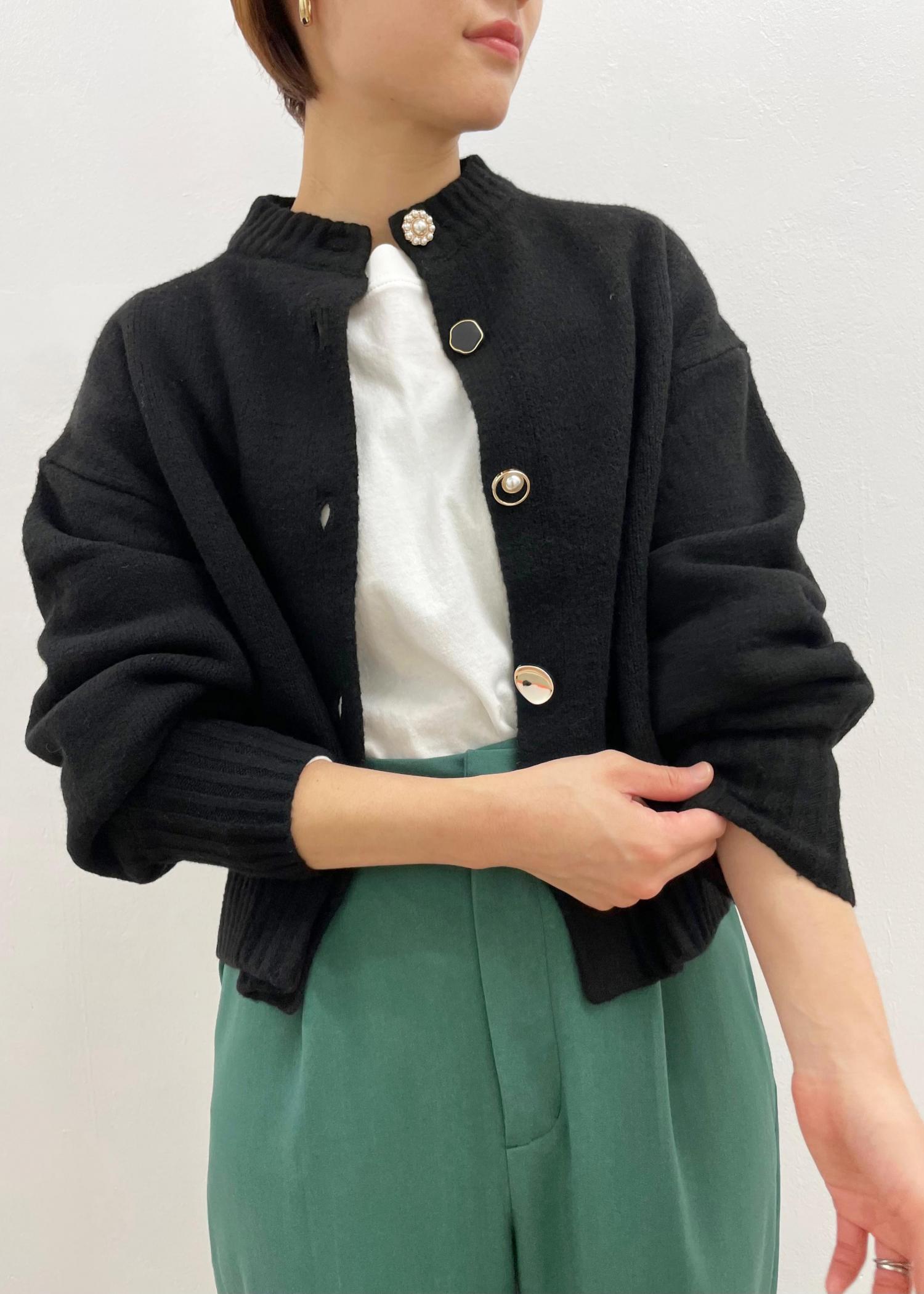 ほんのり甘めなショート丈のカーディガンを合わせて
