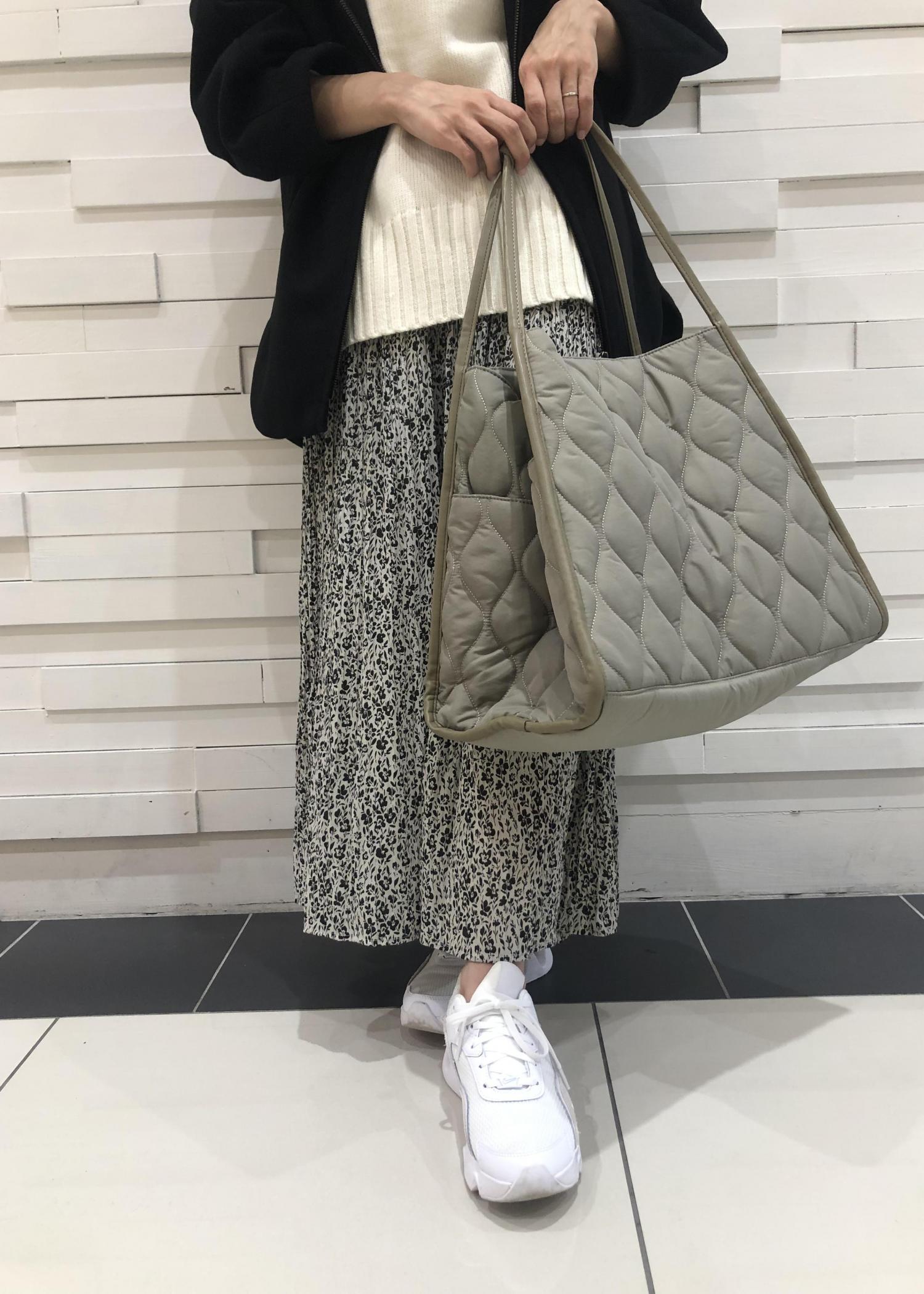 シンプルなモノトーンですが、花柄や大きめのバッグをポイントにしました。