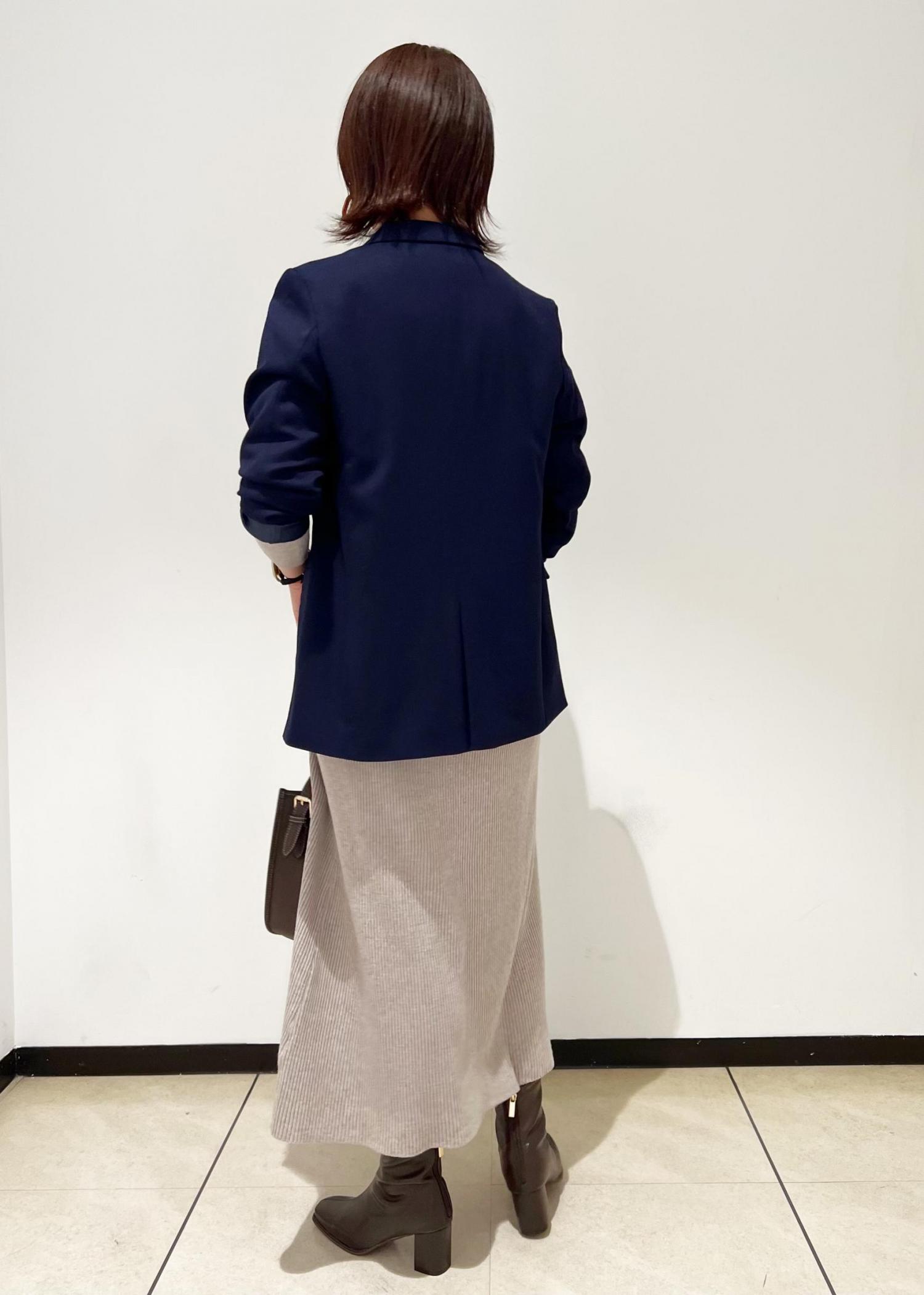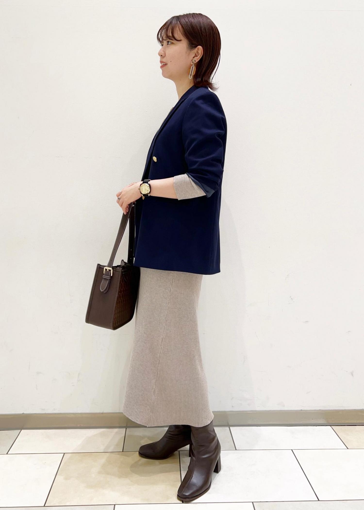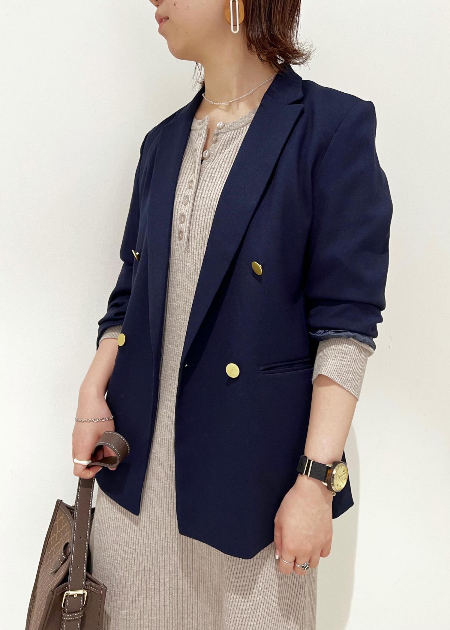 ダブルのハンサムな紺ジャケットをニットのフェミニンなワンピと組み合わせて大人カジュアルなスタイリングを意識しました。