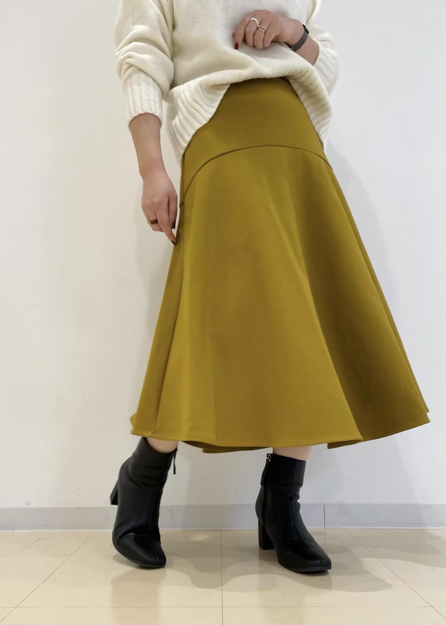 腰あたりの切り替えから外に広がる美シルエットのスカートにシンプルなニットを合わせました◎