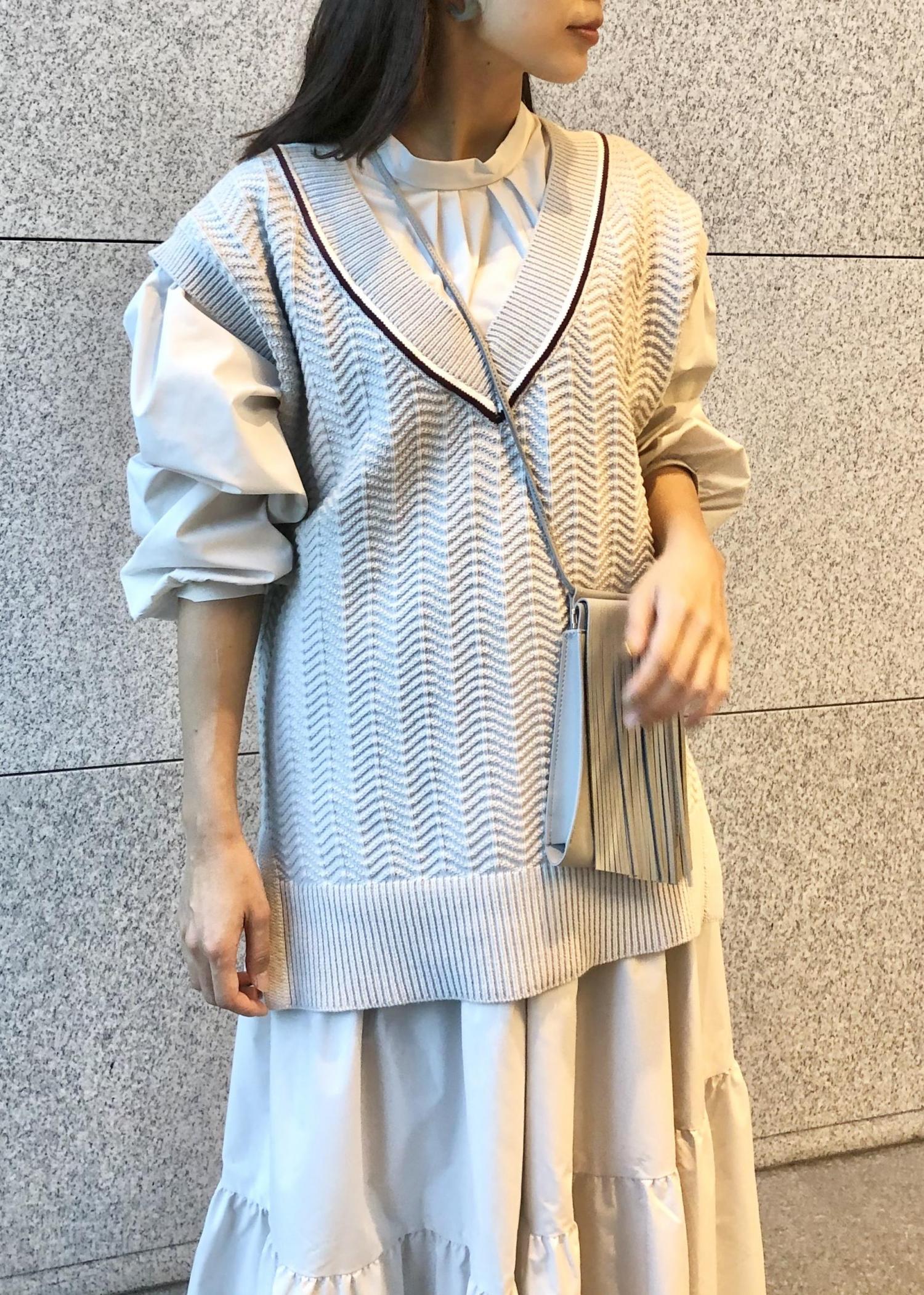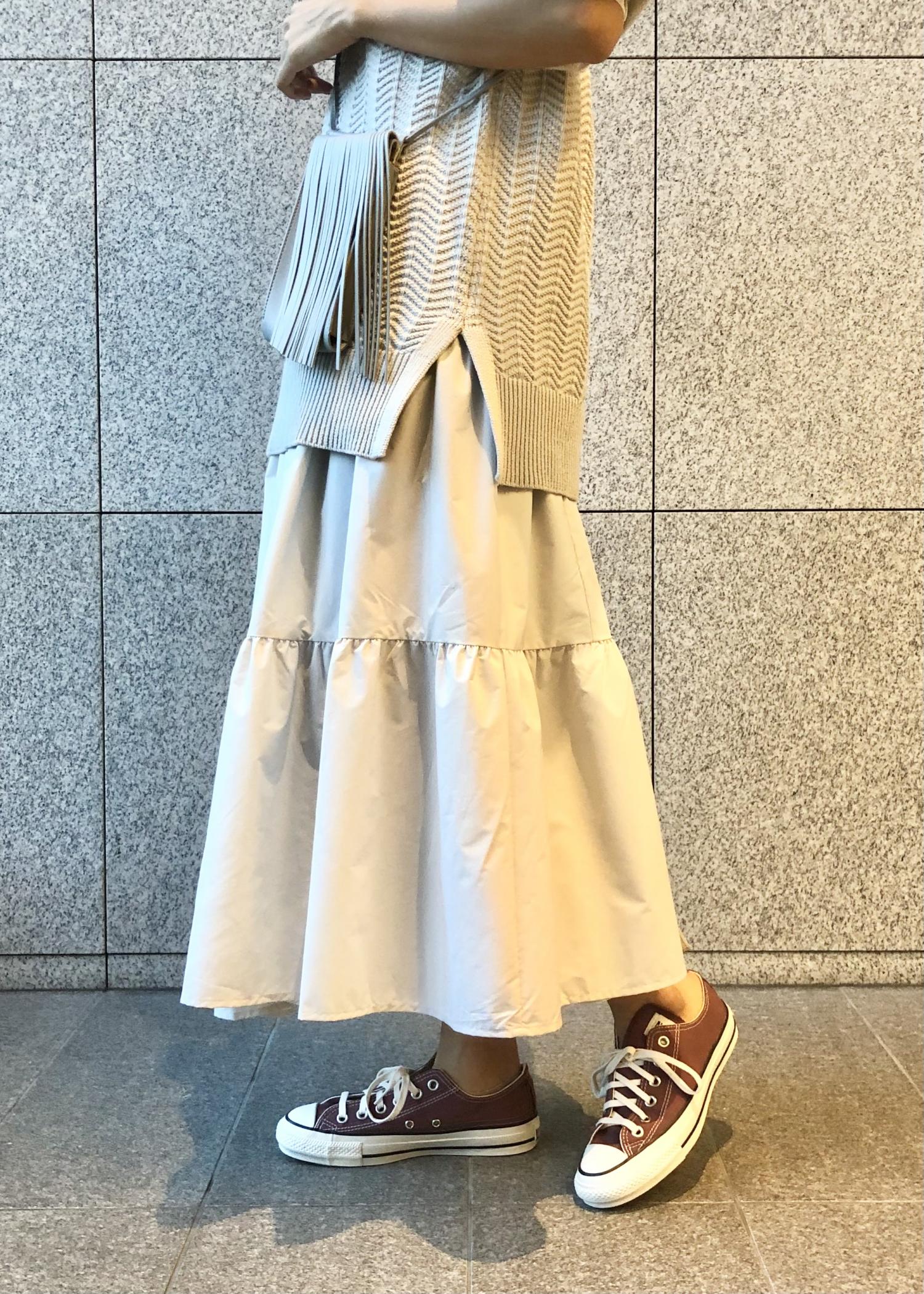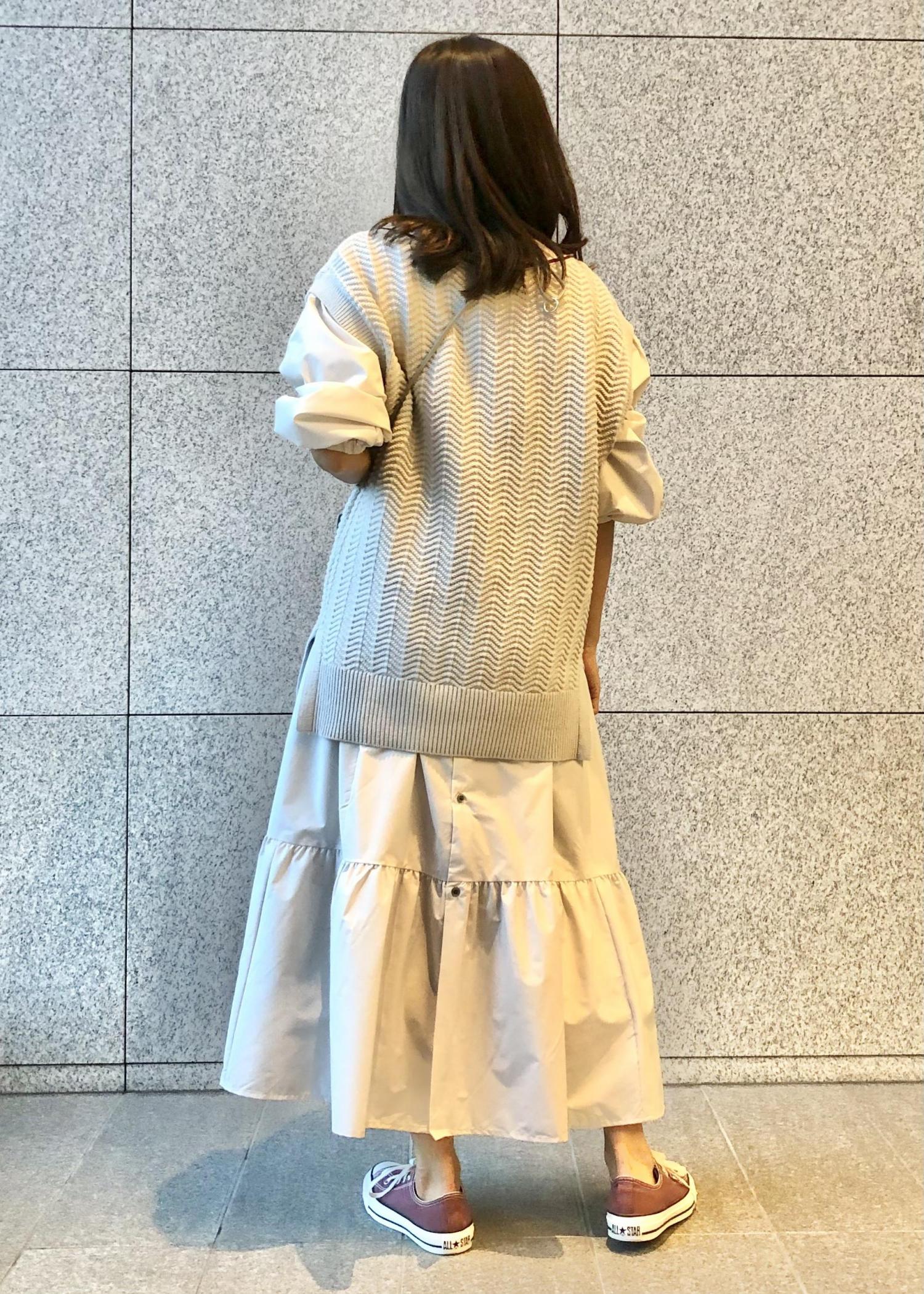 甘くなりがちなティアードのワンピースもニットベストとレイヤードすることで、ボリュームを抑えられスニーカーなどカジュアルテイストに寄せれます。