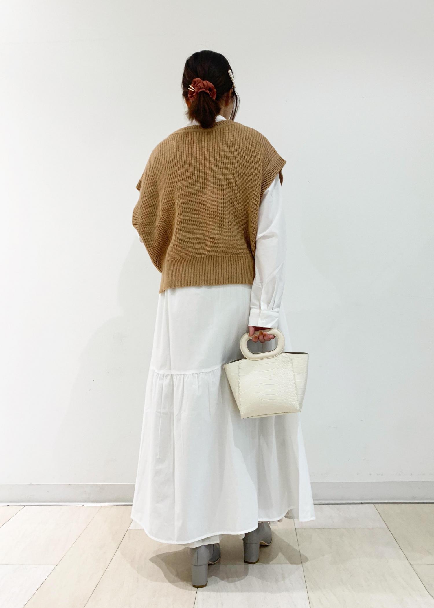 シャツワンピースにチェックコートを合わせたカジュアルコーデにしました。 シャツワンピースはベストと別々に使えるのでコーディネートの幅が広がります。