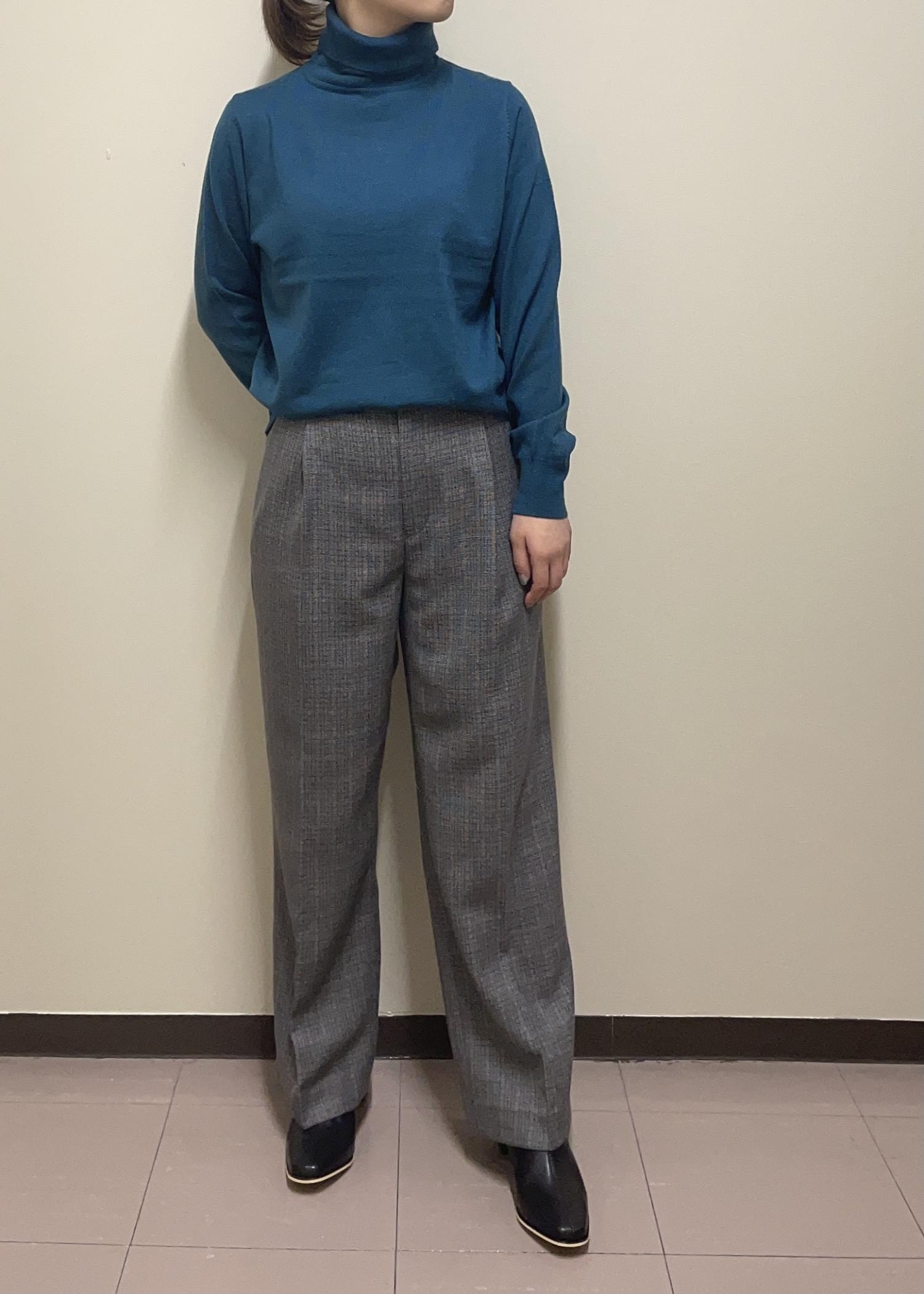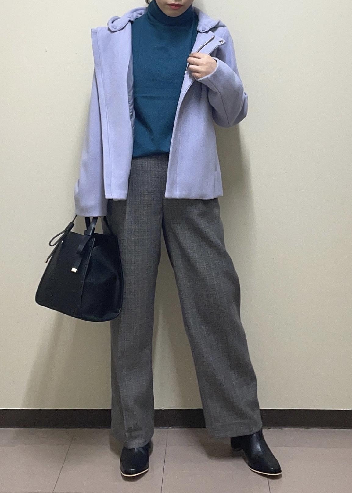タートルは深めのグリーンカラーでシックな印象なのでアウターにあえて淡めのラベンダーを合わせて甘さをプラス!