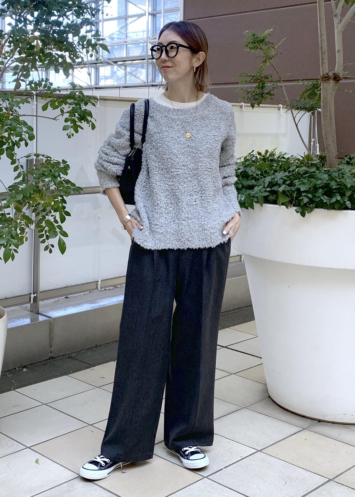 インナーはトレンドのフリルを取り入れたニットで女の子らしいコーデにしました。