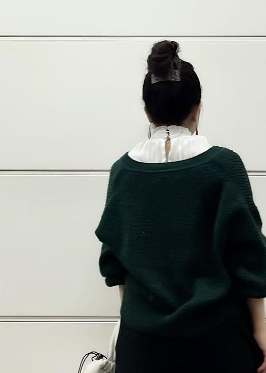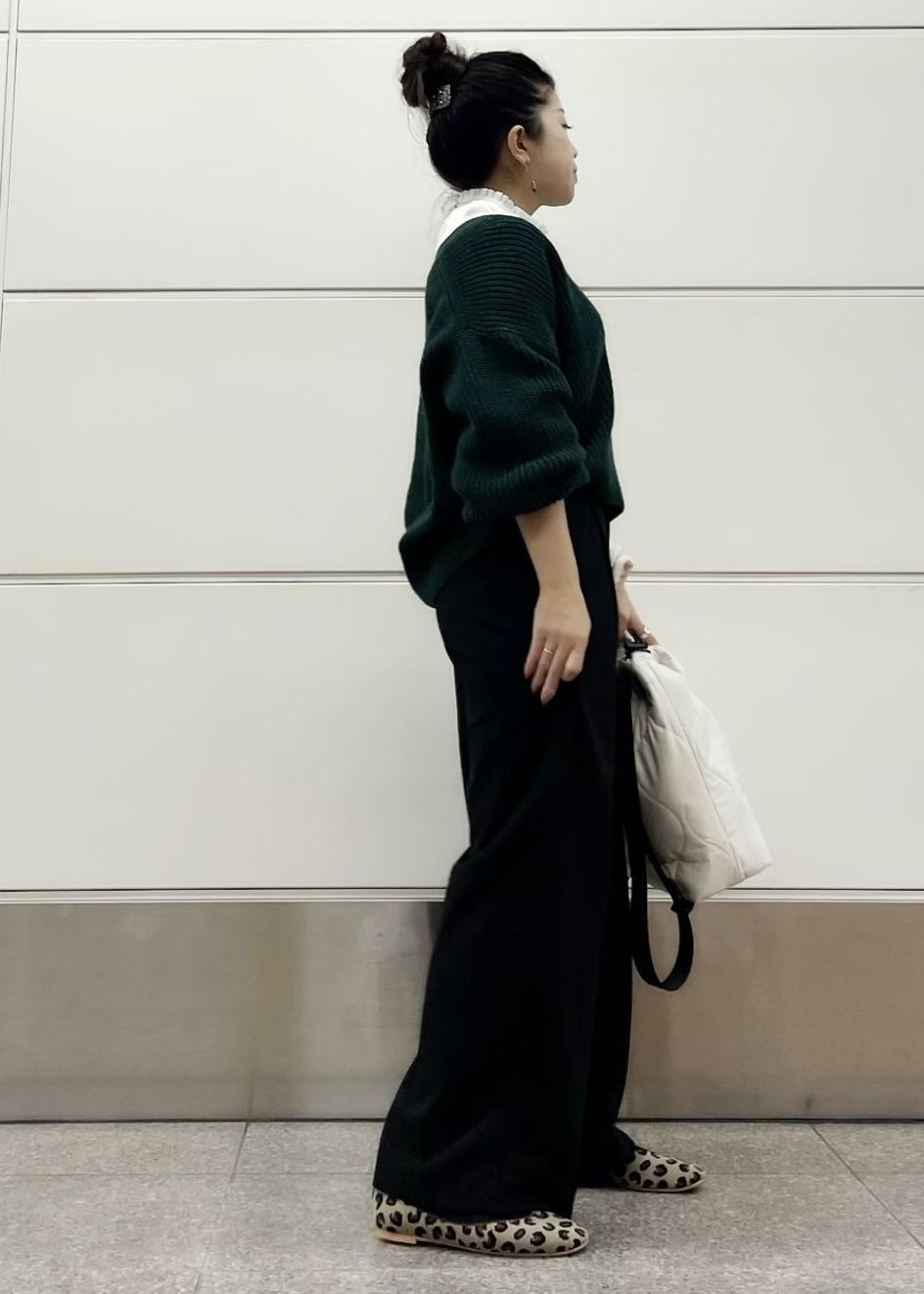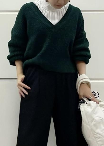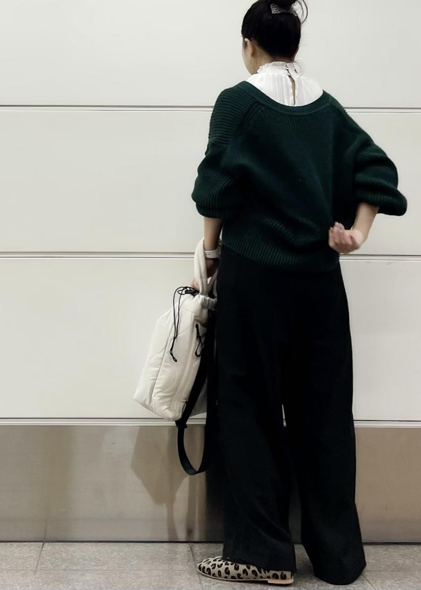 ふっくらとボリュームのあるお袖のニットをシャーリングのレディブラウスでレイヤードしてパンツスタイルがカジュアル見えしない大人女子のシルエットになるようにしました◎